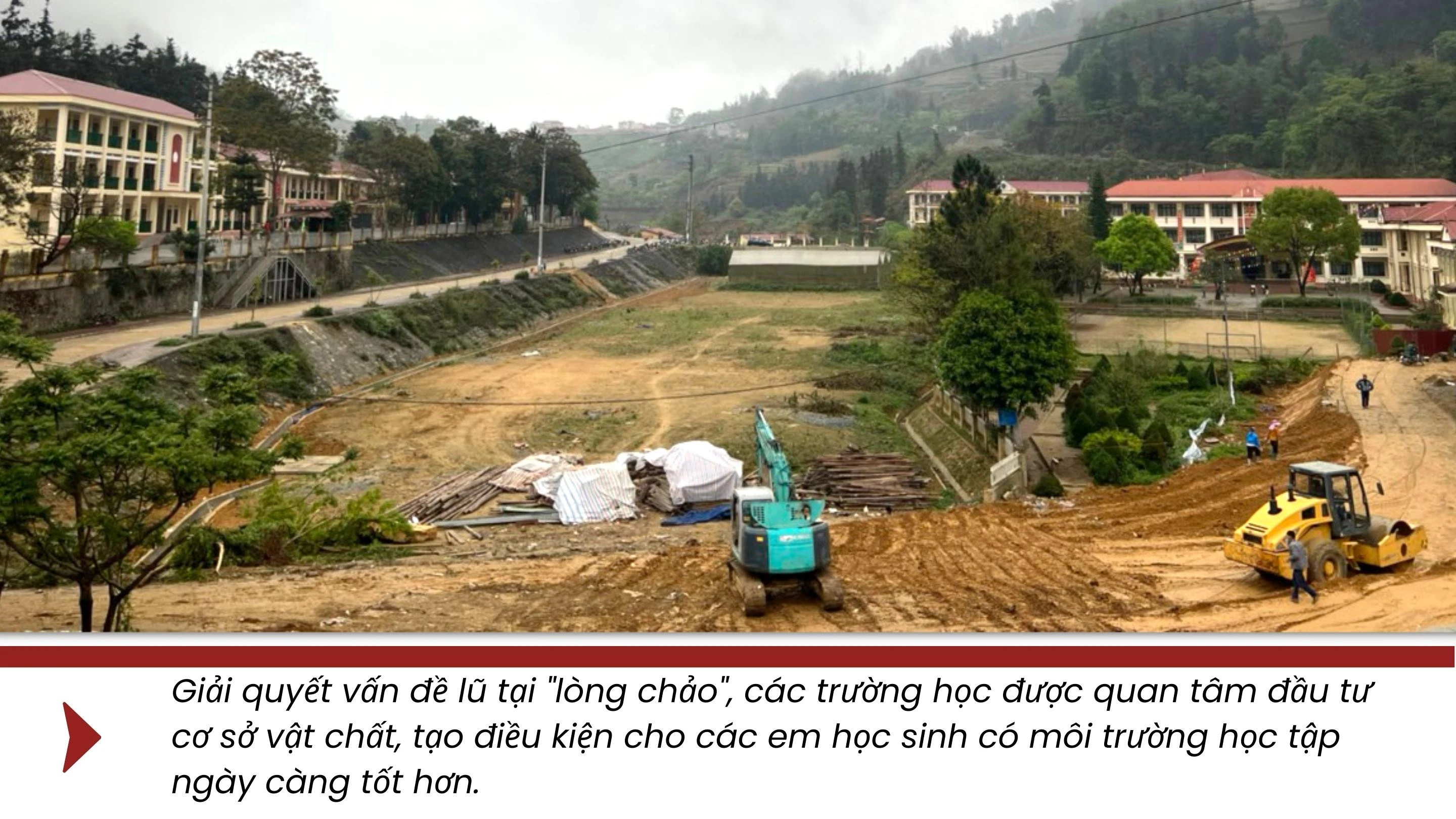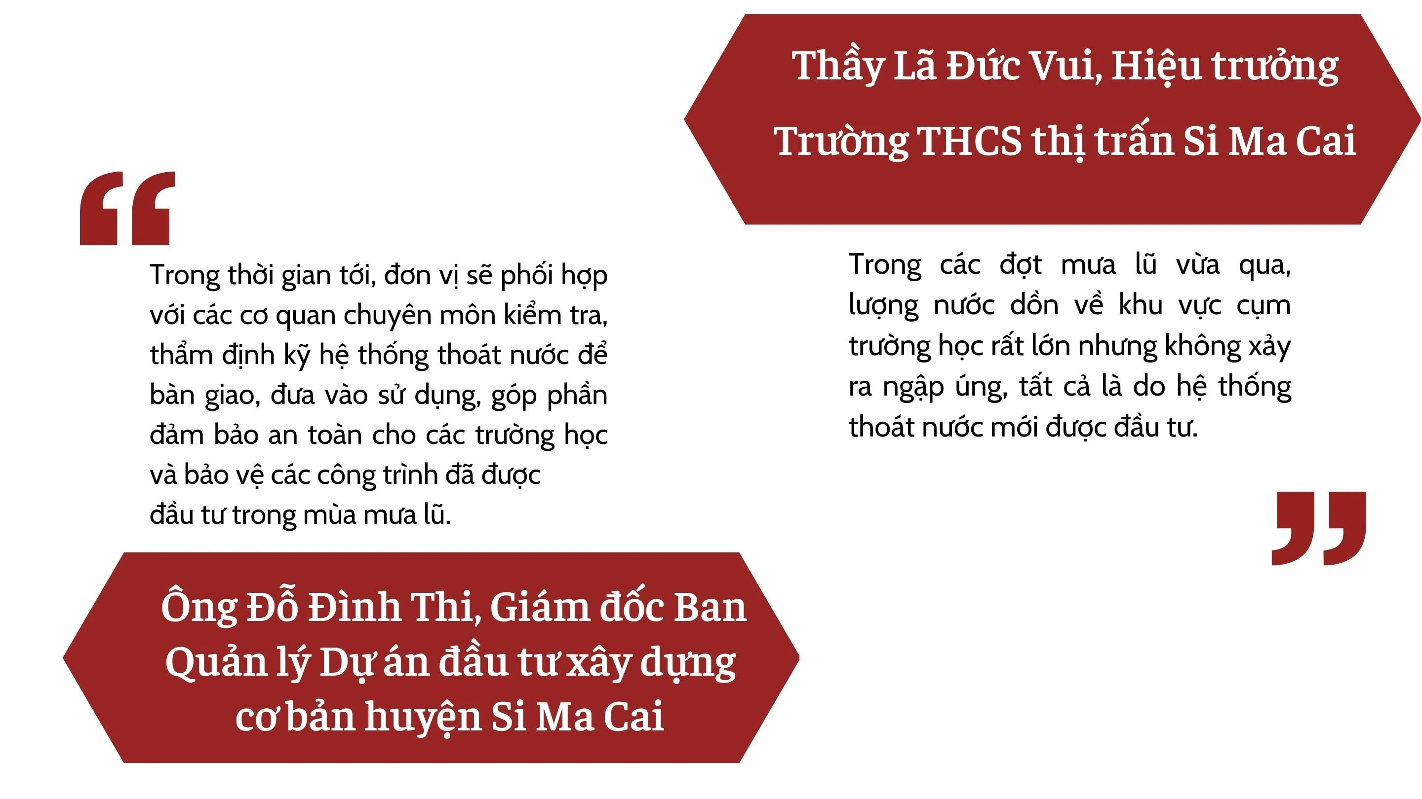 Sau khi khắc phục hậu quả mưa lũ, huyện Si Ma Cai xác định nhiệm vụ quan trọng và ưu tiên hàng đầu là tìm giải pháp để khắc phục triệt để tình trạng ngập úng đối với khu vực lòng chảo. UBND huyện Si Ma Cai đã chỉ đạo các phòng, ban chuyên môn kiểm tra thực tế, đánh giá nguyên nhân, trên cơ sở đó đưa ra giải pháp kỹ thuật. Được UBND tỉnh phê duyệt, UBND huyện Si Ma Cai đã triển khai Dự án xây lắp hệ thống thoát lũ tại cụm trường với tổng kinh phí đầu tư 14 tỷ đồng.