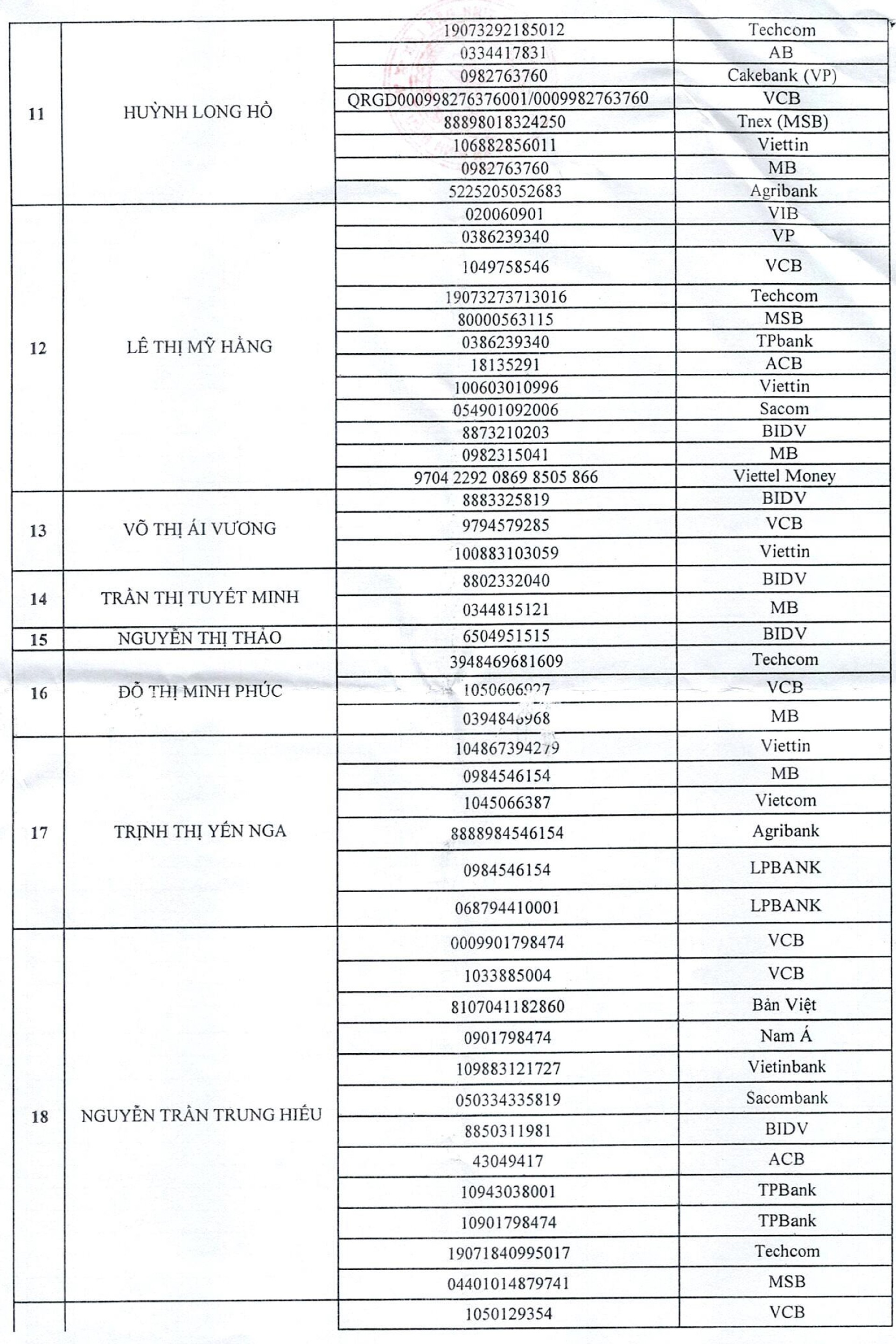 Đăng tải thông tin tìm kiếm bị hại của vụ án nêu trên, theo đó ai là người đã bị chiếm đoạt tiền theo phương thức, thủ đoạn nêu trên hoặc nhận được tiền từ những số tài khoản trên khi làm nhiệm vụ liên quan Tiktok thì liên hệ ngay Cơ quan An ninh điều tra Công an tỉnh Đắk Lắk (địa chỉ: số 34 Hà Huy Tập, phượng Buôn Ma Thuột, tỉnh Đắk Lắk, số điện thoại 069.4389.131 hoặc 069.4389.133) để trình báo. Trường hợp không đến trình báo, Cơ quan An ninh điều tra sẽ xử lý theo quy định của pháp luật.