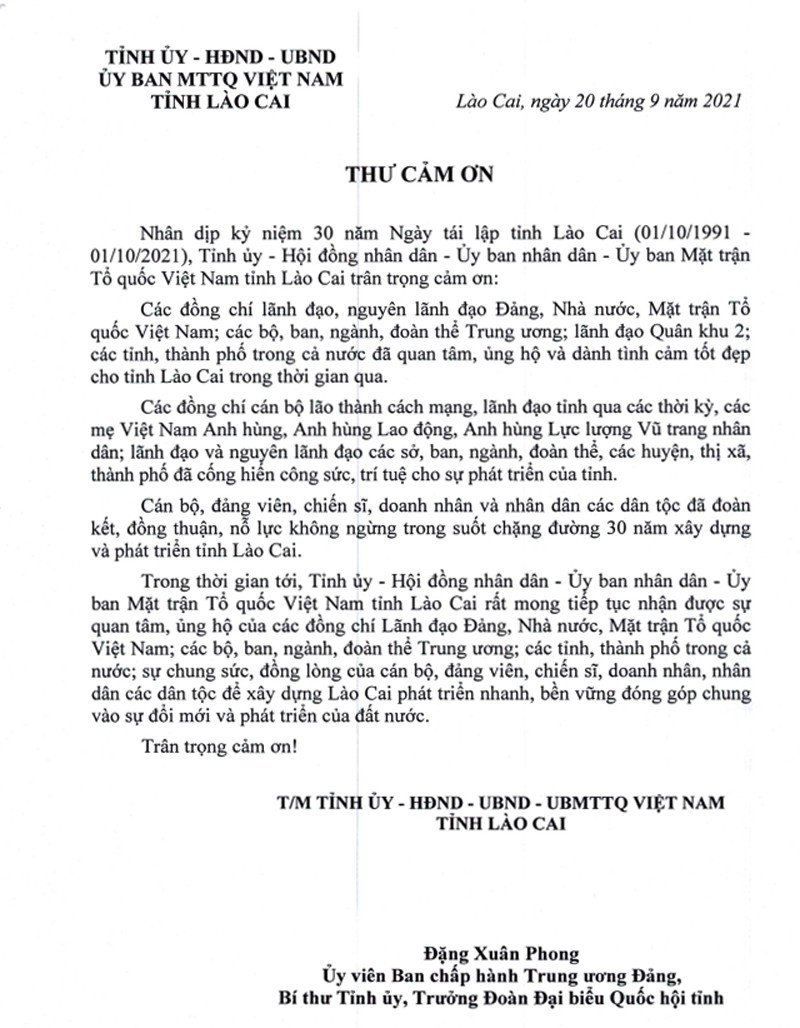 LCĐT - Đồng chí Đặng Xuân Phong, Ủy viên Ban Chấp hành Trung ương Đảng, Bí thư Tỉnh ủy, Trưởng Đoàn đại biểu Quốc hội tỉnh thay mặt Tỉnh ủy, HĐND, UBND tỉnh, Uỷ ban Mặt trận Tổ quốc Việt Nam tỉnh Lào Cai đã gửi Thư cảm ơn nhân dịp kỷ niệm 30 năm Ngày tái lập tỉnh Lào Cai (1/10/1991 – 1/10/2021).