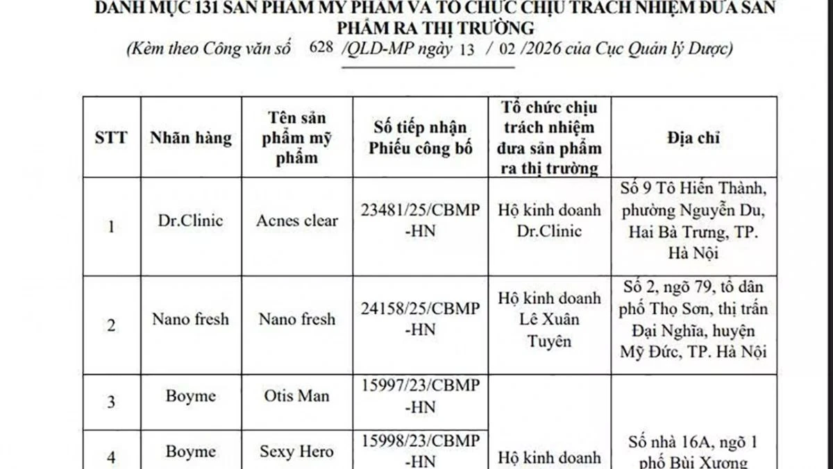 Cụ thể, Cục Quản lý Dược (Bộ Y tế) vừa có văn bản yêu cầu đình chỉ lưu hành và thu hồi mỹ phẩm vi phạm trên toàn quốc và tiêu huỷ đối với 131 loại mỹ phẩm. Các sản phẩm này đều do Công ty Cổ phần sản xuất mỹ phẩm Vincos Việt Nam sản xuất. Doanh nghiệp có địa chỉ tại thôn 3, xã Phú Cát, Hà Nội. Lý do đình chỉ lưu hành, thu hồi là các sản phẩm mỹ phẩm được sản xuất tại cơ sở này không đáp ứng các điều kiện sản xuất mỹ phẩm theo quy định.