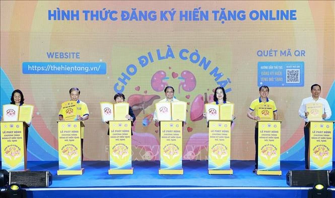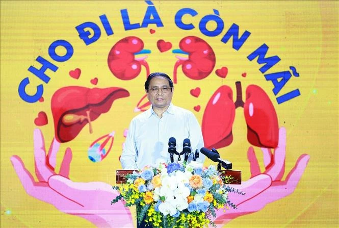 Thủ tướng Phạm Minh Chính phát động Chương trình "Đăng ký hiến tặng mô, tạng - Cho đi là còn mãi”. Ảnh: Dương Giang/TTXVN
