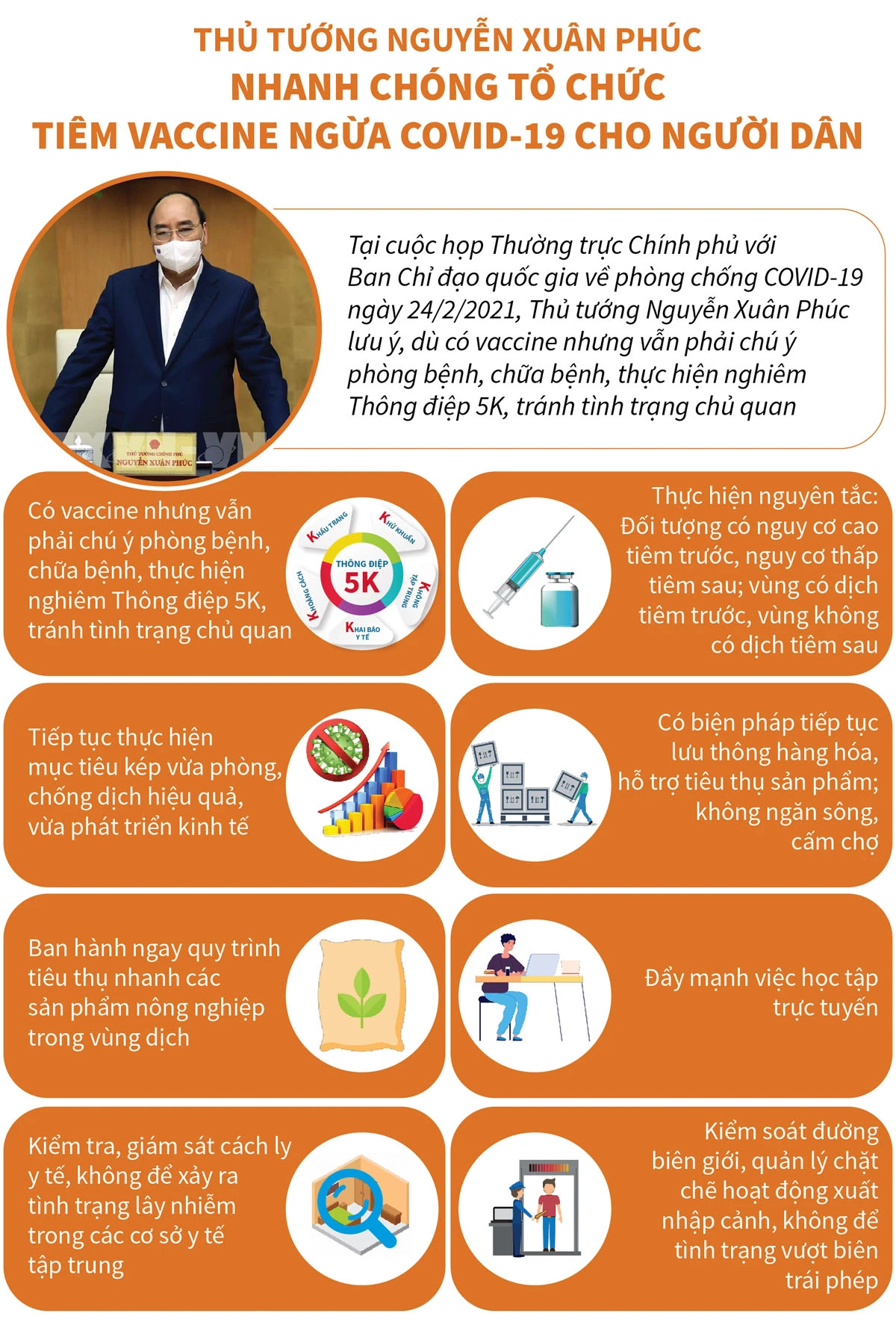 Tại cuộc họp Thường trực Chính phủ với Ban Chỉ đạo quốc gia về phòng chống COVID-19, Thủ tướng Nguyễn Xuân Phúc lưu ý, dù có vaccine nhưng vẫn phải chú ý phòng bệnh, chữa bệnh, thực hiện nghiêm Thông điệp 5K, tránh tình trạng chủ quan.