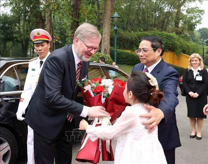 Thủ tướng Phạm Minh Chính ra tận cửa xe ô tô đón Thủ tướng Petr Fiala. Sau cái ôm, bắt tay nồng ấm giữa hai Thủ tướng, các cháu học sinh gửi tới Thủ tướng Petr Fiala bó hoa tươi thắm. Thủ tướng Phạm Minh Chính mời Thủ tướng Petr Fiala bước trên thảm đỏ trong sự vẫy chào của các em học sinh với cờ hoa rực rỡ trên tay.