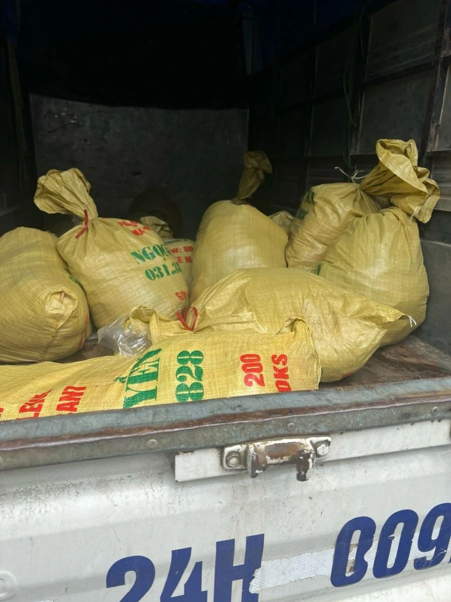Trong đó, 5 bao tải màu vàng, bên trong mỗi bao tải có 50 túi lạp xưởng bảo quản lạnh, trên túi có in chữ Trung Quốc, tổng trọng lượng là 125 kg; 8 bao tải màu vàng, bên trong mỗi bao tải có 5 túi chân gà, trên các túi có in chữ Trung Quốc, tổng trọng lượng là 400 kg.