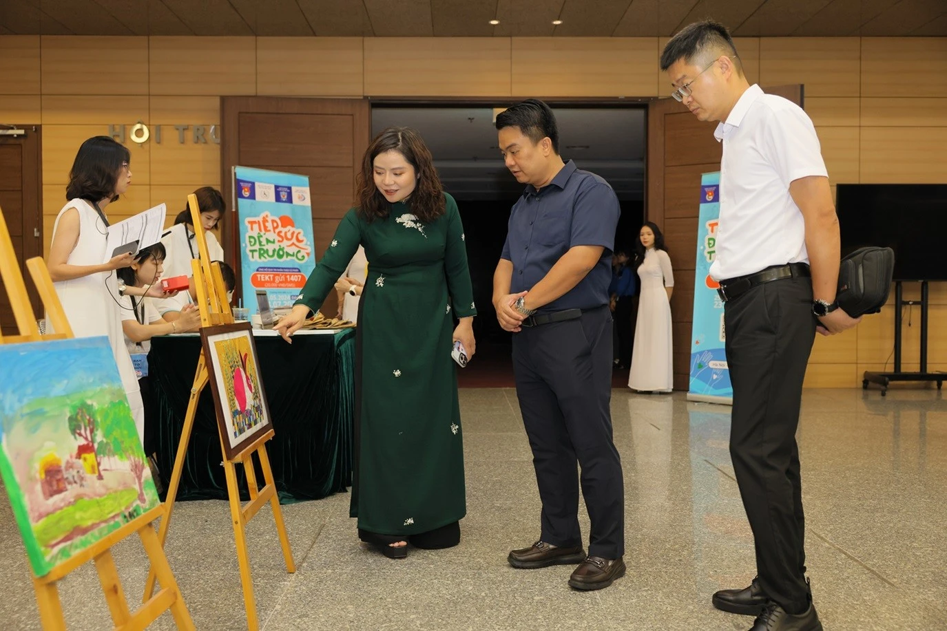 Bà Dương Thị Bích Diệp (áo dài xanh) giới thiệu tranh của các em khuyết tật đến các đại biểu tham dự chương trình.