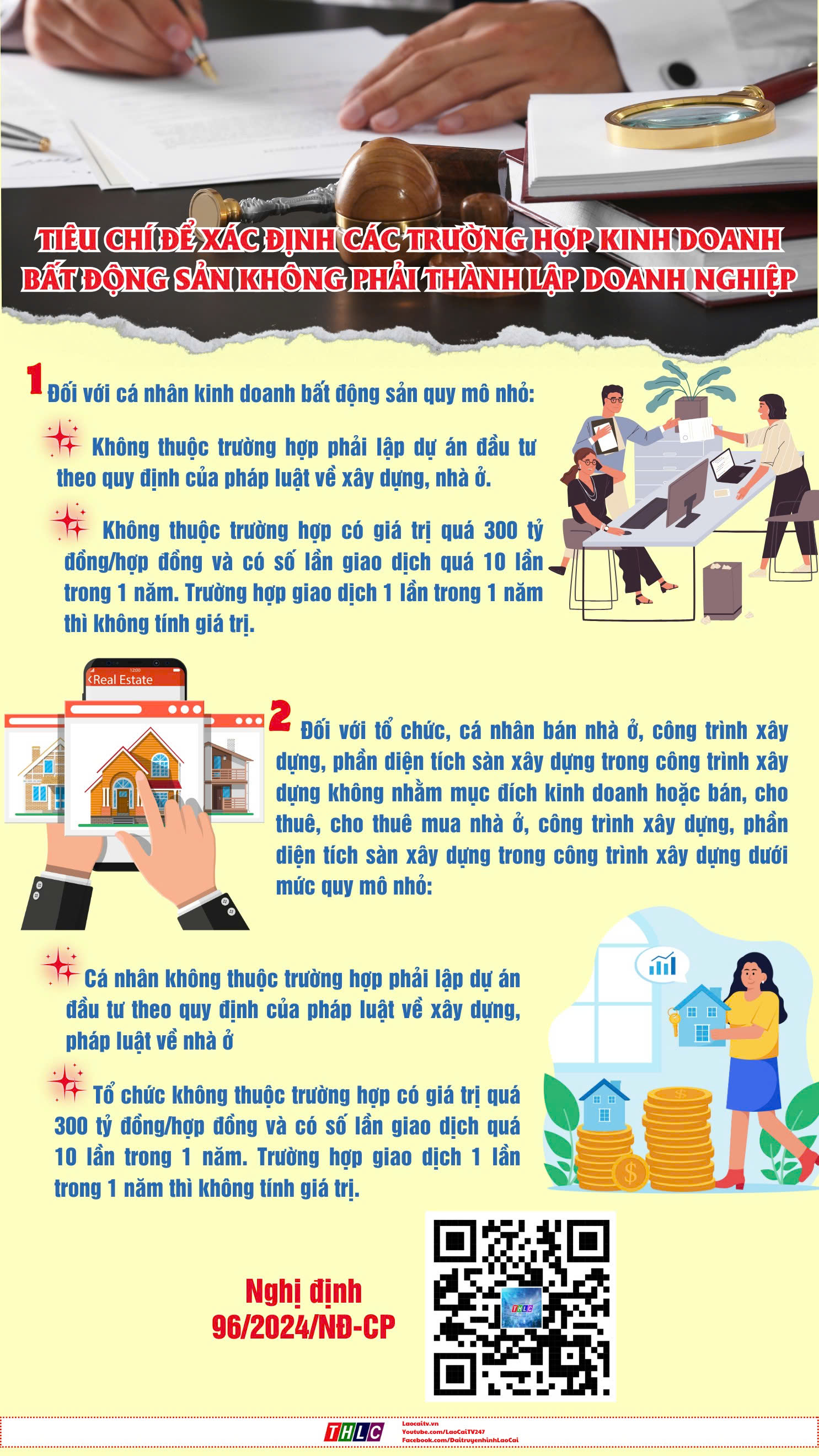 Laocaitv.vn - Điều 7, Nghị định 96/2024 của Chính phủ quy định tiêu chí xác định các trường hợp kinh doanh bất động sản không phải thành lập doanh nghiệp như sau: