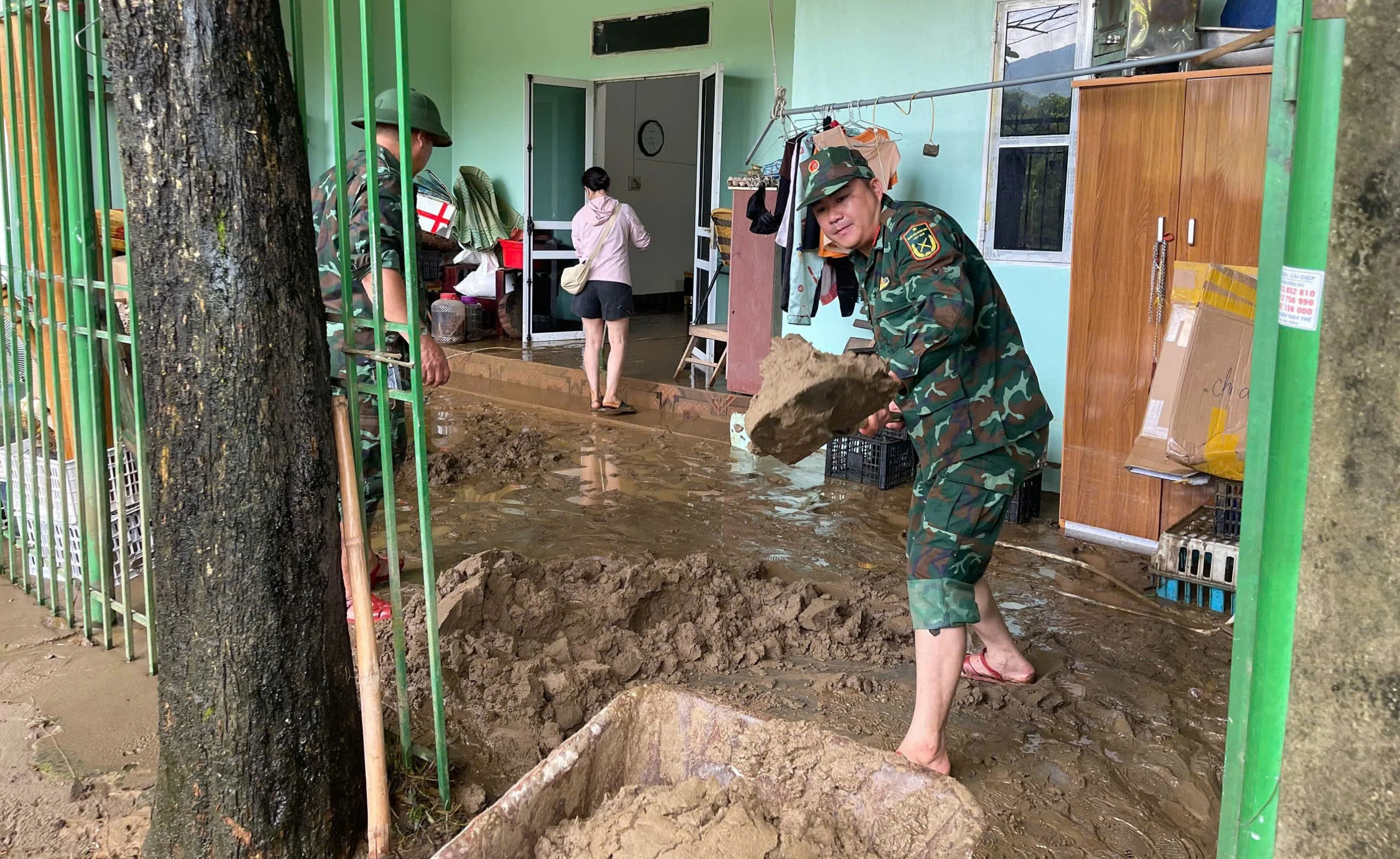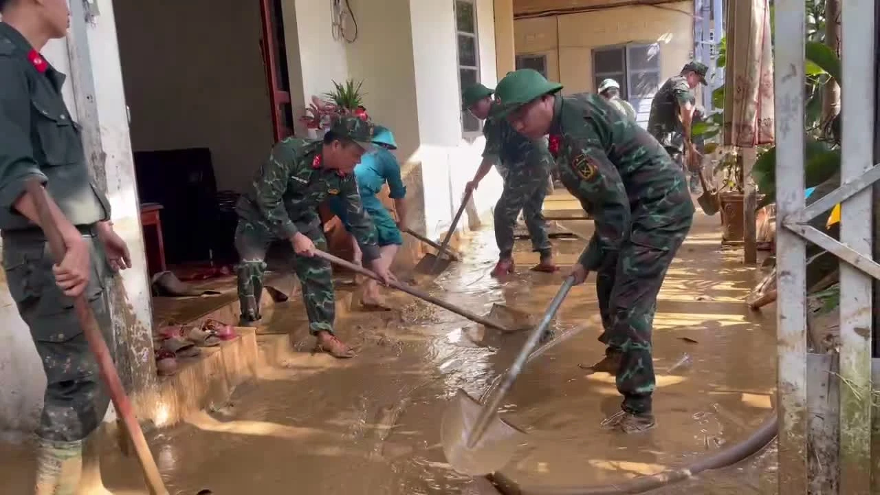Tại đây, các cán bộ, chiến sĩ đã tham gia dọn đất đá, nạo vét rãnh thoát nước, gia cố lại tường rào, mái tôn, khơi thông dòng chảy và giúp dân vận chuyển tài sản đến nơi an toàn.