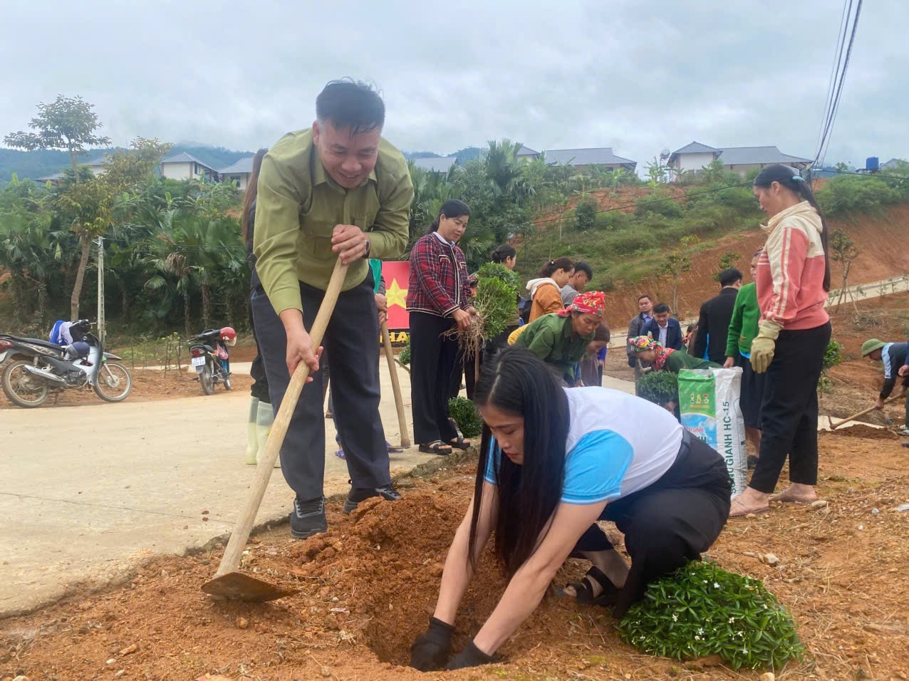 Cán bộ, hội viên phụ nữ tham gia trồng 1,3 km đường hoa tại thôn Làng Nủ - Ảnh: Hội LHPN xã Phúc Khánh