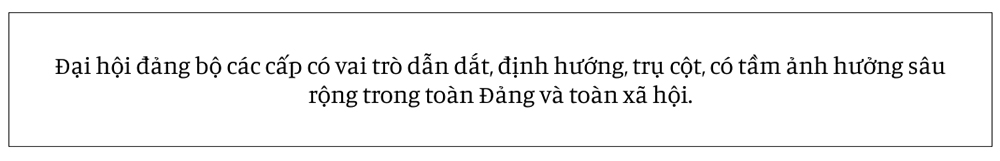 Thực tiễn cách mạng Việt Nam cho thấy, đại hội đảng bộ các cấp có vai trò dẫn dắt, định hướng, trụ cột, có tầm ảnh hưởng sâu rộng trong toàn Đảng và toàn xã hội. Đại hội đảng bộ các cấp nhiệm kỳ này có 3 nhiệm vụ trọng tâm, đó là: thảo luận, thông qua văn kiện đại hội cấp mình và góp ý với dự thảo văn kiện đại hội cấp trên, văn kiện Đại hội XIV của Đảng; lựa chọn nhân sự tham gia cấp ủy các cấp; hoàn thiện nhân sự trong hệ thống cơ quan lãnh đạo của Đảng từ cấp cơ sở đến cấp Trung ương. Những nội dung trên đều là vấn đề "cốt tử”, hệ trọng, liên quan đến vai trò lãnh đạo, cầm quyền, sức chiến đấu của Đảng; đến việc hoạch định chủ trương, đường lối, chính sách, biện pháp lãnh đạo; quyết định sức mạnh nội bộ Đảng và hệ thống chính trị; đến toàn bộ hoạt động lãnh đạo của tổ chức đảng các cấp trong nhiệm kỳ tới cũng như sức mạnh của toàn dân tộc trong tương lai.