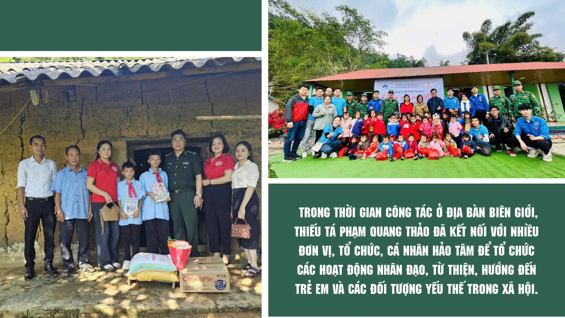 Đồng hành với người dân biên giới, hằng năm, anh đã tham mưu cho cấp ủy đảng, chỉ huy đơn vị phối hợp với các tổ chức, cá nhân trong và ngoài tỉnh tổ chức các chương trình nhân đạo, từ thiện, như: “Kết nối biên cương, chung tay cùng em tới trường”, “Lan tỏa yêu thương - hướng về biên giới”, “Xuân Biên phòng - ấm lòng dân bản”, “Vươn tới ước mơ”, “Hành quân xanh”… Riêng năm 2024, thông qua các chương trình đã trao tặng học bổng, quà cho học sinh mồ côi, có hoàn cảnh khó khăn trên địa bàn với trị giá 250 triệu đồng. Ngoài ra, đã hỗ trợ lợn giống, cây trồng, phân bón và đồ gia dụng trị giá hơn 500 triệu đồng cho các gia đình khó khăn, giúp các hộ giảm nghèo, phát triển kinh tế trên địa bàn biên giới...