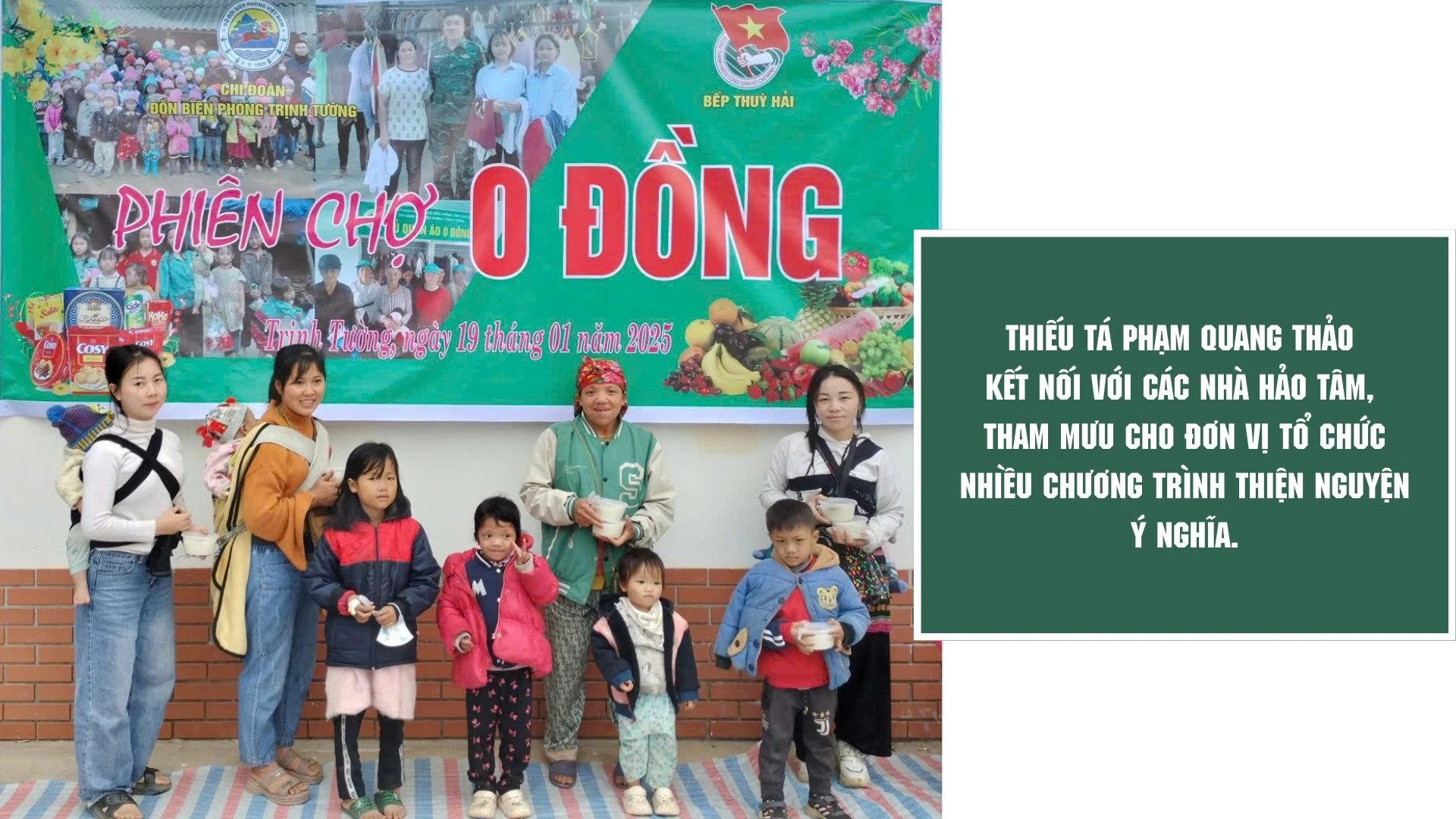 Ngoài mô hình trên, tháng 12/2024, anh Thảo cũng tham mưu, trực tiếp kết nối với các nhà hảo tâm để tổ chức chương trình “Bữa cơm 0 đồng” và “Nồi cháo yêu thương” hằng tuần. Qua đó, đã trao tặng khoảng 250 - 300 suất cơm, cháo miễn phí/tuần cho người dân có hoàn cảnh khó khăn trên địa bàn. Anh Thảo tâm sự: Chia sẻ, giúp đỡ đồng bào có hoàn cảnh khó khăn không chỉ là tình cảm mà còn là trách nhiệm của bộ đội biên phòng. Đối với cán bộ làm công tác vận động quần chúng, việc làm này giúp tăng cường tình đoàn kết, gắn bó quân - dân, lồng gắn tuyên truyền, vận động hiệu quả để người dân địa bàn biên giới đồng lòng, ủng hộ, chung tay cùng bộ đội biên phòng xây dựng và bảo vệ biên giới vững mạnh, giàu đẹp.