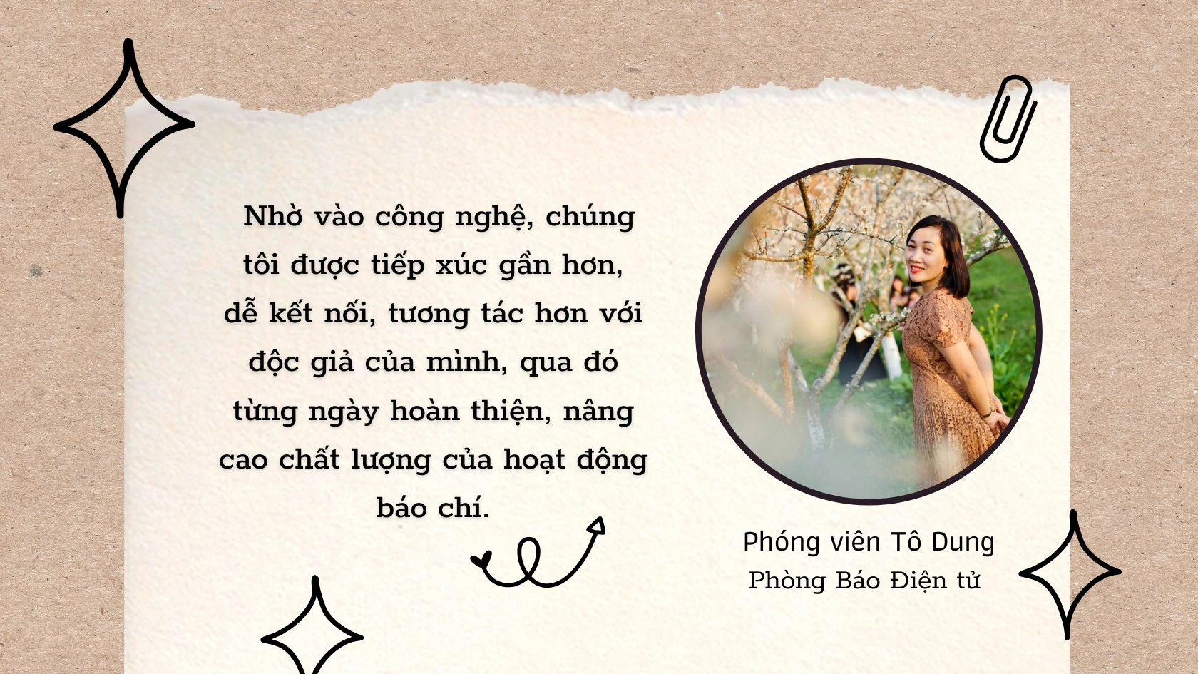 Phóng viên Tô Dung, Phòng Báo Điện tử cho biết: Tòa soạn hội tụ được đưa vào hoạt động, phóng viên cũng cần tác nghiệp hội tụ để có thể tiếp cận với từng đối tượng độc giả của mình bằng nhiều phương thức khác nhau. Cùng một nội dung, thay vì chỉ khai thác thông tin, chụp ảnh minh họa, chúng tôi “đa năng hơn” khi có thể quay phim, ghi âm, sáng tạo trong trình bày nội dung với sự hỗ trợ của các ứng dụng công nghệ trí tuệ nhân tạo, có thể đưa tin trên nhiều nền tảng để tiếp cận nhiều đối tượng bạn đọc khác nhau.