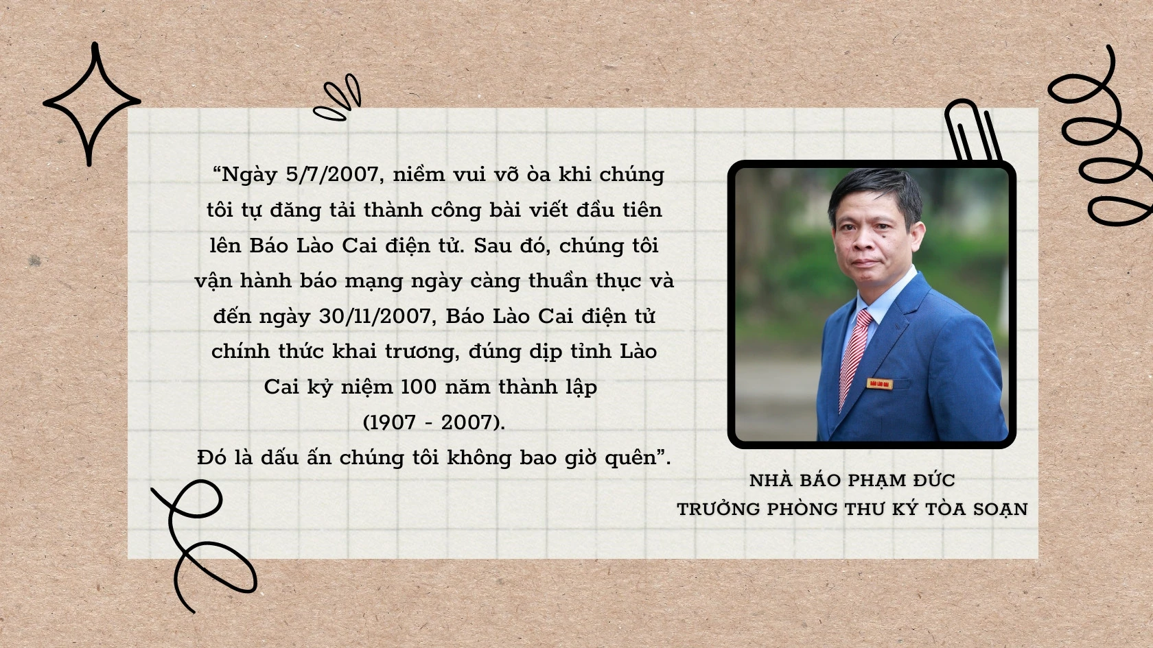 Năm 2007, Báo Lào Cai điện tử chính thức xuất bản trên mạng internet. Nhà báo Phạm Đức thời điểm đó được giao phụ trách Báo Điện tử (hiện là Trưởng phòng Thư ký tòa soạn) nhớ lại: Chuẩn bị cho việc đưa Báo Lào Cai điện tử (baolaocai.vn) đi vào hoạt động, Báo Yên Bái đã cử 2 kỹ thuật viên lên hỗ trợ Báo Lào Cai “cầm tay chỉ việc” suốt nhiều ngày. Lúc đó, internet mới phổ biến và tốc độ rất chậm, phóng viên từ hiện trường và biên tập viên trực đều sử dụng mạng 2G của ngành điện lực để gửi, nhận tin, bài, ảnh. Chưa kể các công đoạn gửi, nhận, xử lý hậu kỳ, riêng việc upload 1 bức ảnh lên hệ thống đã mất khoảng 10 phút. Để đăng 1 tin kèm 1 ảnh minh họa, đã mất gần 20 phút. Đó là nếu mạng “bon”, còn nếu mạng bị “đơ” (mà rất thường xuyên xảy ra) thì chưa thể biết khi nào mới xong.