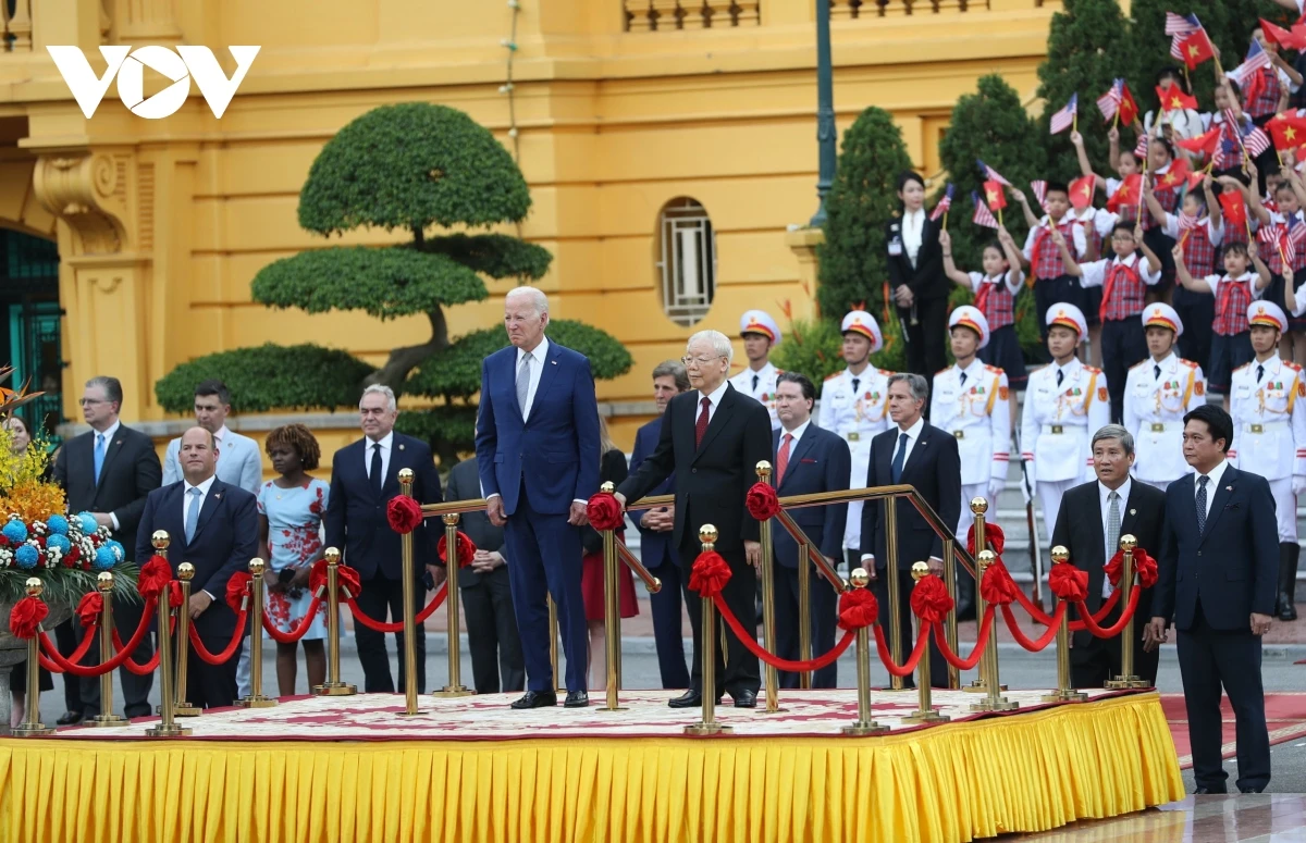 Tổng Bí thư Nguyễn Phú Trọng chủ trì lễ đón Tổng thống Joe Biden tại Phủ Chủ tịch.