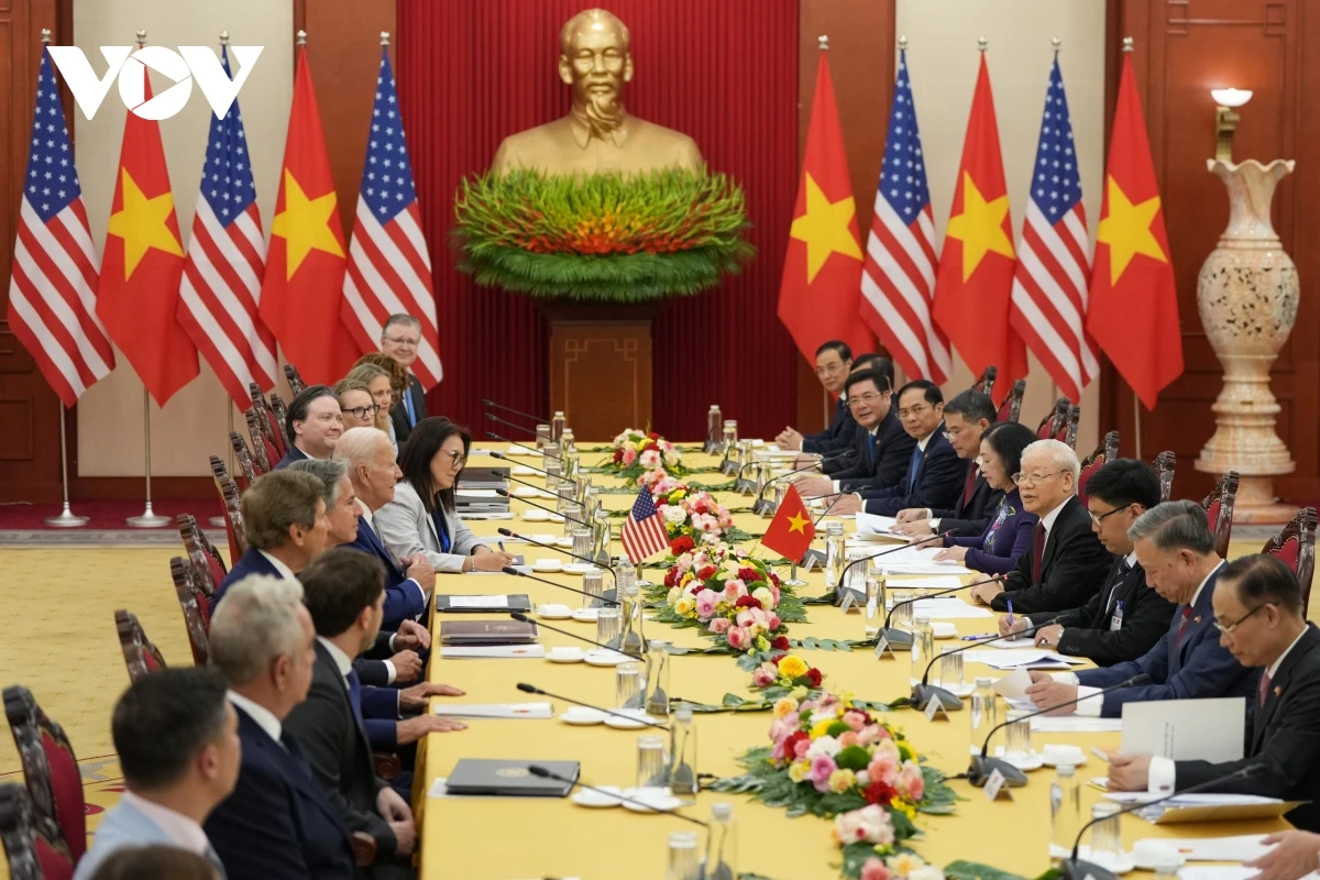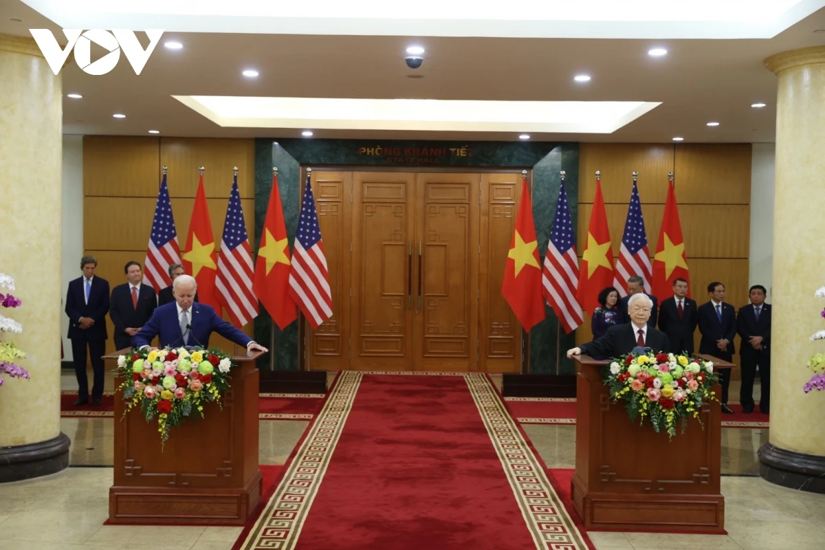 Chiều tối 10/9, sau Lễ đón chính thức và cuộc Hội đàm cấp cao, Tổng Bí thư Nguyễn Phú Trọng và Tổng thống Joe Biden đã phát biểu với báo chí thông tin về kết quả tốt đẹp của cuộc hội đàm và thông báo hai bên đã thông qua Tuyên bố chung, nâng tầm quan hệ Việt Nam - Hoa Kỳ lên Đối tác Chiến lược Toàn diện vì hòa bình, hợp tác, phát triển bền vững.