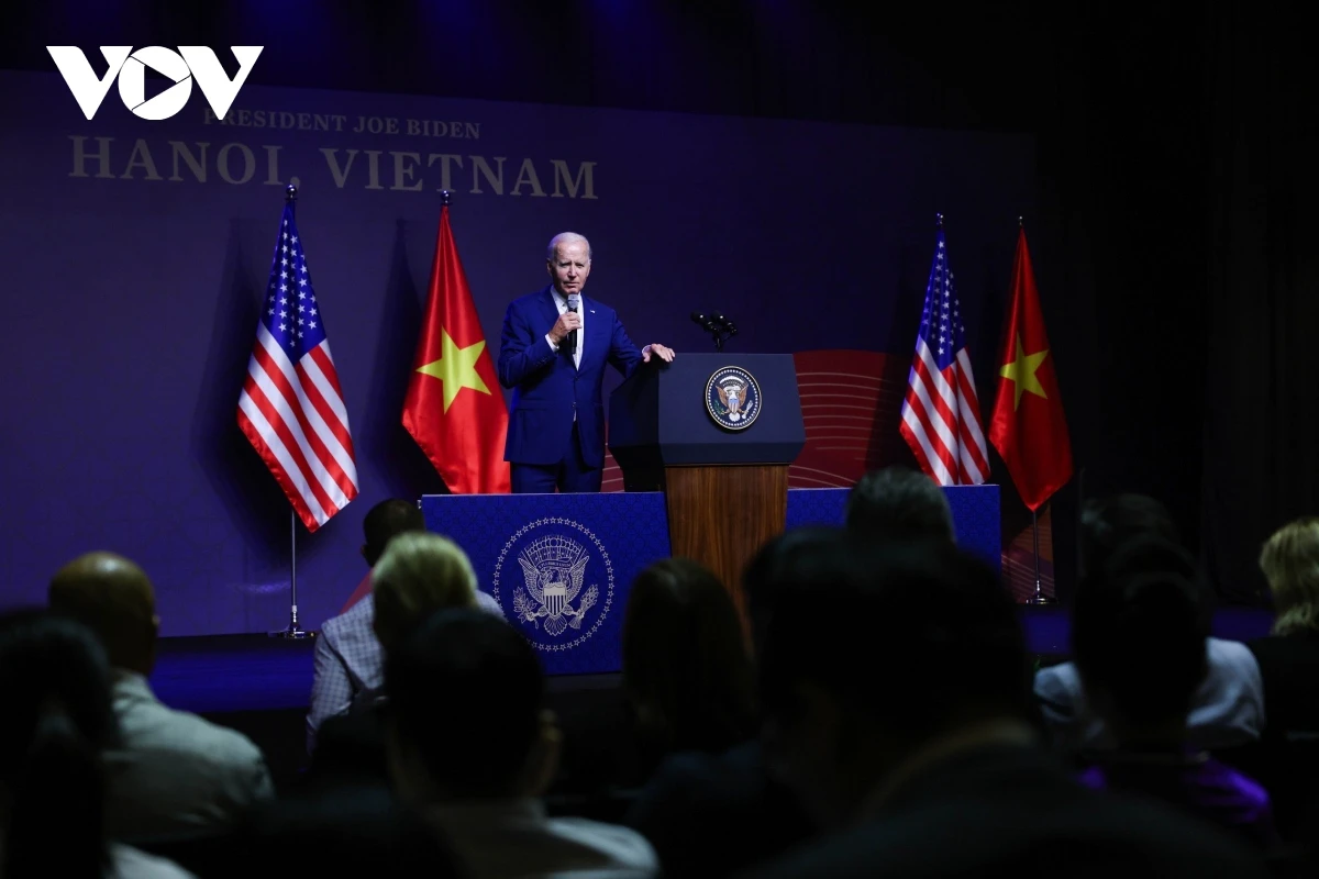 Họp báo tối 10/9 tại khách sạn Marriott, Hà Nội, Tổng thống Biden cảm ơn sự đón tiếp của Việt Nam và nhấn mạnh chuyến thăm cấp Nhà nước của ông mang tính lịch sử.