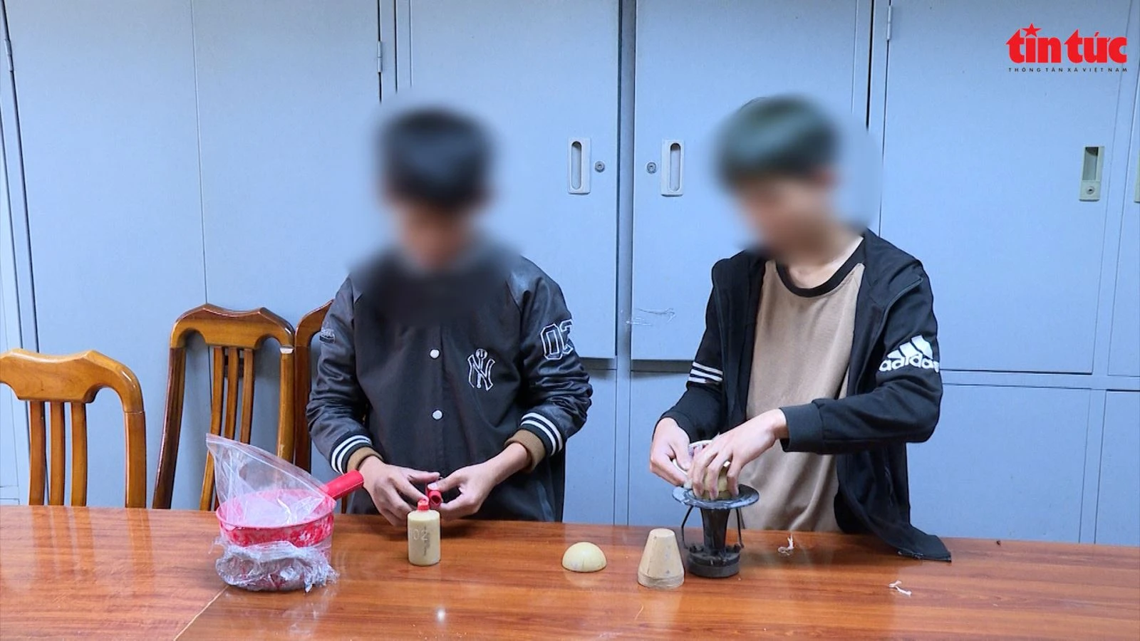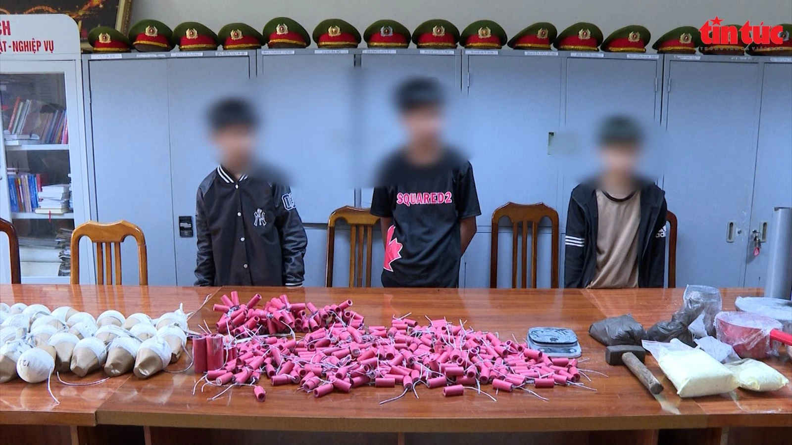 Qua tìm hiểu trên mạng xã hội, đối tượng Đinh Văn Nguyên (ngoài cùng bên trái, sinh năm 2008, trú tại huyện Đông Anh, Hà Nội) đã thuê thêm 2 người để tự sản xuất pháo lậu tại nhà riêng.