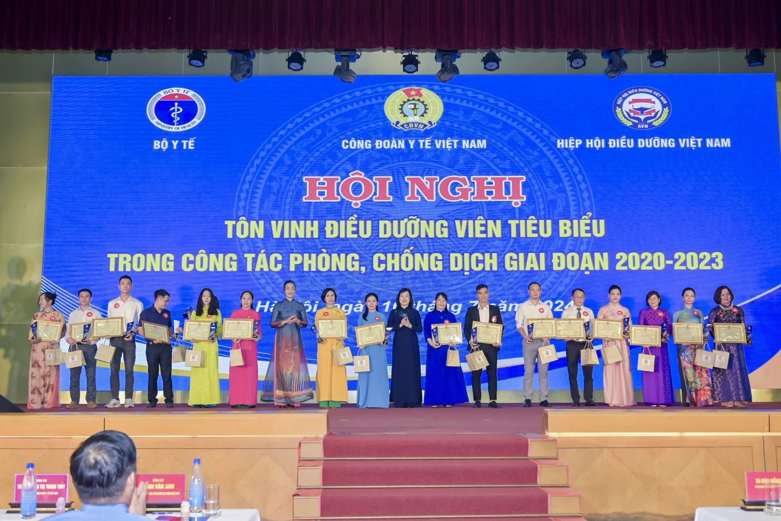 Tại buổi lễ, Công đoàn Y tế Việt Nam đã tôn vinh 135 điều dưỡng có thành tích xuất sắc trong công tác phòng chống dịch giai đoạn 2020-2023 (có 90 câu chuyện hay truyền cảm hứng).