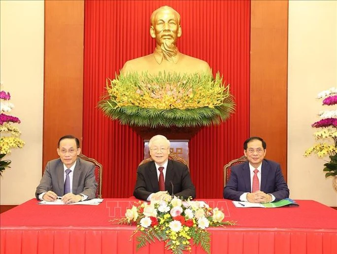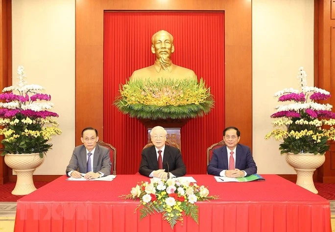 Tổng Bí thư Nguyễn Phú Trọng, Trưởng Ban Đối ngoại Trung ương Lê Hoài Trung và Bộ trưởng Ngoại giao Bùi Thanh Sơn tại cuộc điện đàm với Tổng thống Pháp Emmanuel Macron.