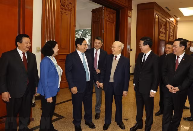 Tổng Bí thư nhấn mạnh, trong quá trình xây dựng các văn kiện Đại hội XIV của Đảng, phải gắn kết nhuần nhuyễn việc nghiên cứu lý luận với tổng kết thực tiễn phát triển trên các lĩnh vực chính trị, kinh tế, văn hóa, xã hội, quốc phòng, an ninh, đối ngoại; với xây dựng Đảng và hệ thống chính trị, hình thành đồng bộ thể chế phát triển nhanh và bền vững đất nước dựa trên những trụ cột là nền kinh tế thị trường định hướng xã hội chủ nghĩa Việt Nam, Nhà nước pháp quyền xã hội chủ nghĩa Việt Nam và nền dân chủ xã hội chủ nghĩa Việt Nam.