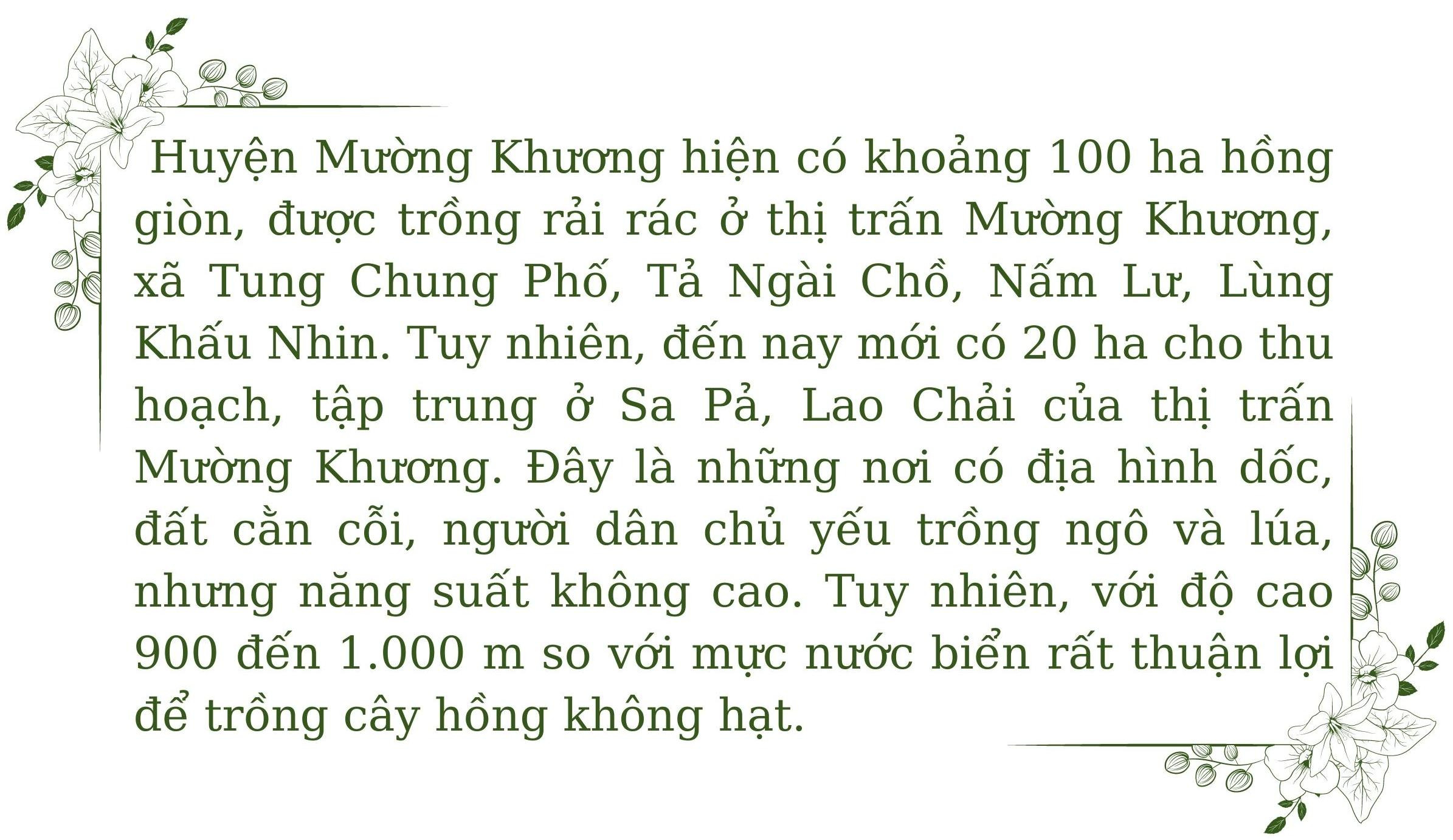 “Trồng cây hồng giòn đòi hỏi kỹ thuật tương đối cao và phải đầu tư công chăm sóc, phân bón nhiều hơn, nếu không đảm bảo hai yếu tố trên có thể dẫn đến cây bị chết hoặc tỷ lệ đậu quả không ổn định. Nếu làm tốt thì đây sẽ là cây trồng mang lại hiệu quả kinh tế cao, trên 100 triệu đồng/ha, cao gấp 4 - 5 lần so với trồng ngô”, Trưởng Phòng Nông nghiệp và Phát triển nông thôn huyện Mường Khương Lê Thanh Hoa cho biết.