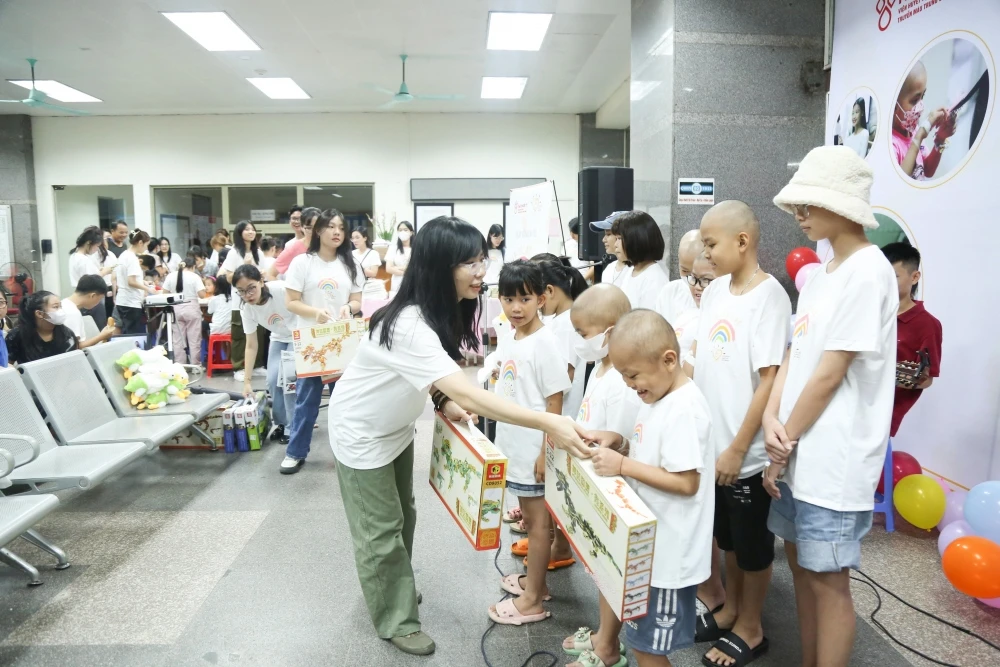 Bệnh nhi nhận bộ tóc mới trong chương trình sáng 8/10 (Ảnh: Viện Huyết học - Truyền máu Trung ương).