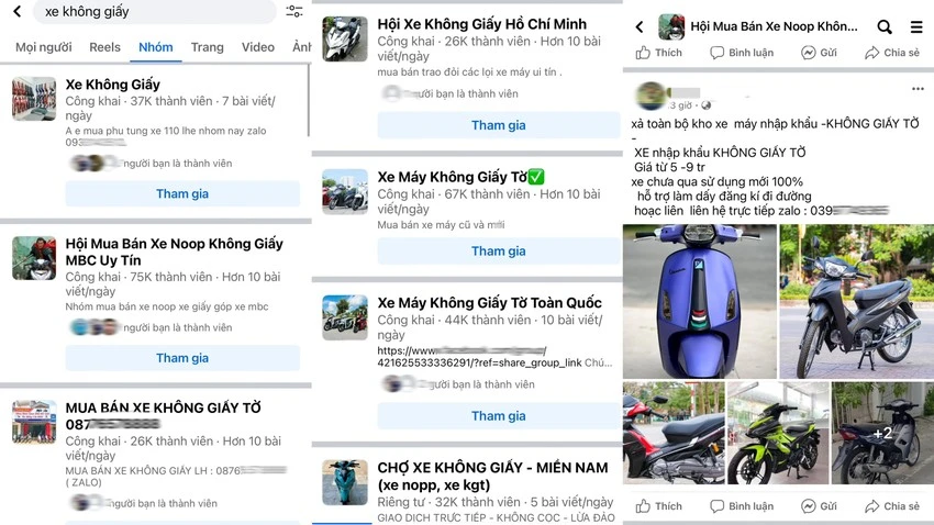 Chỉ cần vào mạng Facebook tìm kiếm các cụm từ “mua bán xe không giấy tờ”, “xe không giấy” sẽ xuất hiện hàng loạt hội nhóm chuyên mua bán, giao dịch các loại xe không có giấy tờ.