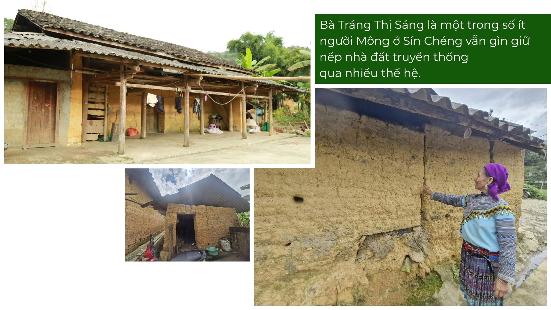 Năm nay đã 67 tuổi, nhưng bà Tráng Thị Sáng, dân tộc Mông, thôn Sín Chải, xã Sín Chéng vẫn sống trong căn nhà đất truyền thống. Bà Sáng bảo căn nhà này đã được 60 năm, còn căn nhà mới bên cạnh cũng làm được 50 năm. Mặc dù hai ngôi nhà làm đã lâu, tường đất nứt nẻ, nhưng bà Sáng luôn tự hào về ngôi nhà gắn bó với gia đình bà qua mấy thế hệ.