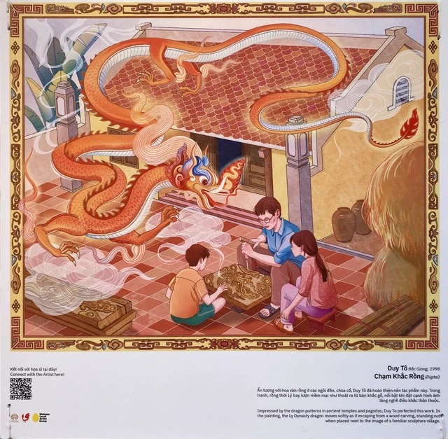 Ấn tượng với hoa văn rồng ở các ngôi đền, chùa cổ, tác giả Duy Tô đã hoàn thành tác phẩm “Chạm khắc rồng”. Trong tranh, rồng thời Lý bay lượn mềm mại như thoát ra từ bản khắc gỗ, nổi bật khi đặt cạnh hình ảnh làng nghề điêu khắc quen thuộc.