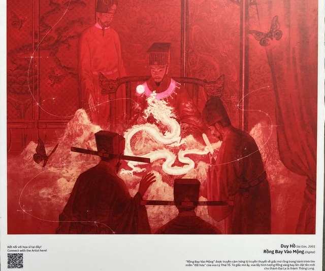 Tác phẩm “Rồng bay vào mộng” của tác giả Duy Hồ lấy cảm hứng từ truyền thuyết về giấc mơ rồng trong hành trình tìm “miền đất hứa” của vua Lý Thái Tổ. Từ giấc mơ đó, vua lấy hình tượng rồng vàng bay lên đặt tên mới cho thành Đại La là thành Thăng Long.