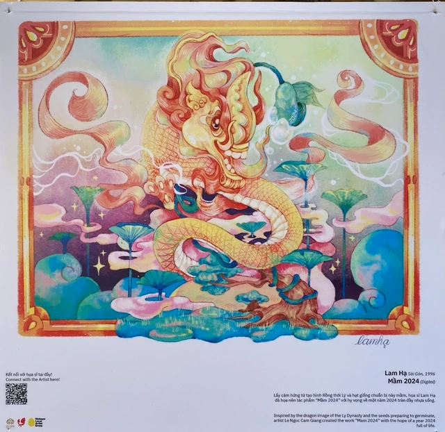 Lấy cảm hứng từ tạo hình rồng thời Lý và hạt giống chuẩn bị nảy mầm, họa sĩ Lam Hạ đã khắc họa nên tác phẩm “Mầm 2024” với hy vọng về một năm mới tràn đầy nhựa sống.