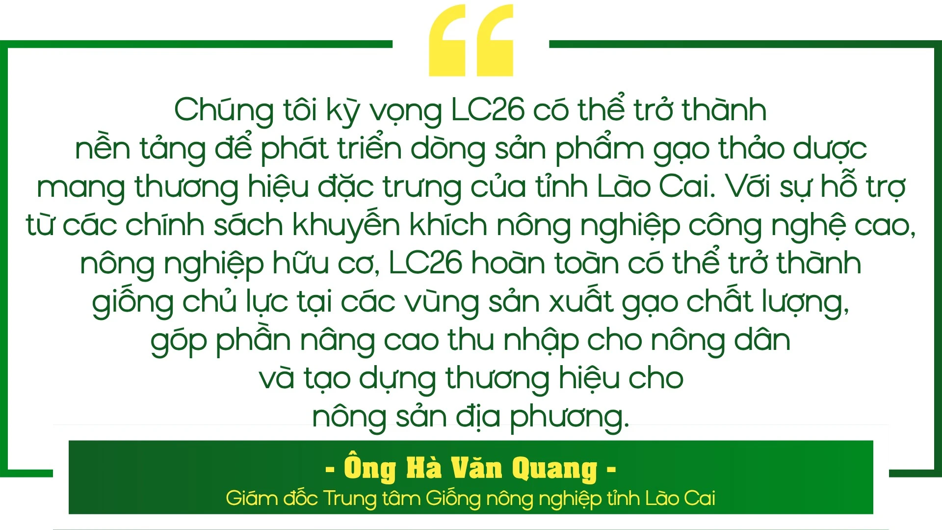 Với những ưu điểm vượt trội cả về năng suất, khả năng chống chịu và giá trị dinh dưỡng, LC26 là minh chứng rõ nét cho hướng đi đổi mới trong nghiên cứu giống cây trồng - kết hợp giữa khoa học - kỹ thuật với yêu cầu thực tiễn của thị trường. Việc phát triển thành công giống lúa LC26 không chỉ mang lại lợi ích kinh tế mà còn là bước tiến trong việc chăm sóc sức khỏe cộng đồng thông qua lựa chọn thực phẩm lành mạnh, giàu giá trị sinh học. Giống lúa mới được kỳ vọng trở thành một trong những giống lúa chủ lực, góp phần thúc đẩy phát triển nền nông nghiệp xanh, an toàn và bền vững ở Lào Cai trong thời gian tới.