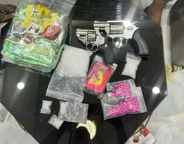Khám xét chiếc ôtô BS: 63A-210.38 của Nhân đang đậu trước căn hộ, trinh sát phát hiện thu giữ dưới ghế tài xế trong xe 1 khẩu súng ngắn. Trong chiếc túi đeo trên người của Nhân, trinh sát thu giữ 3 gói ma túy đá có khối lượng 6,1494 gram, ma túy ở thể rắn loại ketamine; 2 gói nylon chứa 16 viên nén màu hồng có khối lượng 6,5538 gam; 3 gói nylon màu đỏ có ghi chữ “Ferrari” chứa chất bột, có khối lượng 20,2946 gam ma túy ở thể rắn, loại methamphetamine, ketamine, nimetazepam.