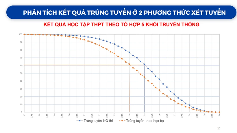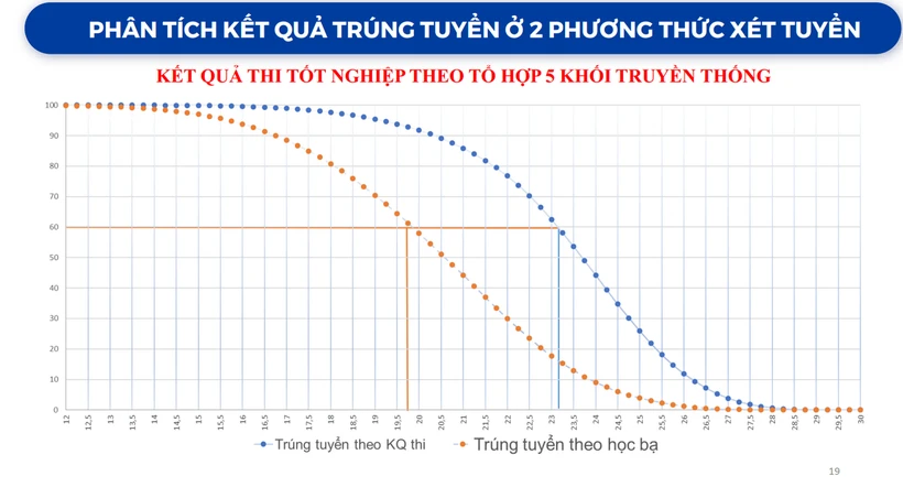 Kết quả cho thấy, có 60% thí sinh trúng tuyển bằng học bạ có tổng điểm thi tốt nghiệp THPT theo tổ hợp 3 môn khoảng 20 điểm. Trong khi đó, 60% thí sinh trúng tuyển bằng phương thức xét điểm thi tốt nghiệp THPT có điểm thi tốt nghiệp THPT 3 môn trên 23 điểm.