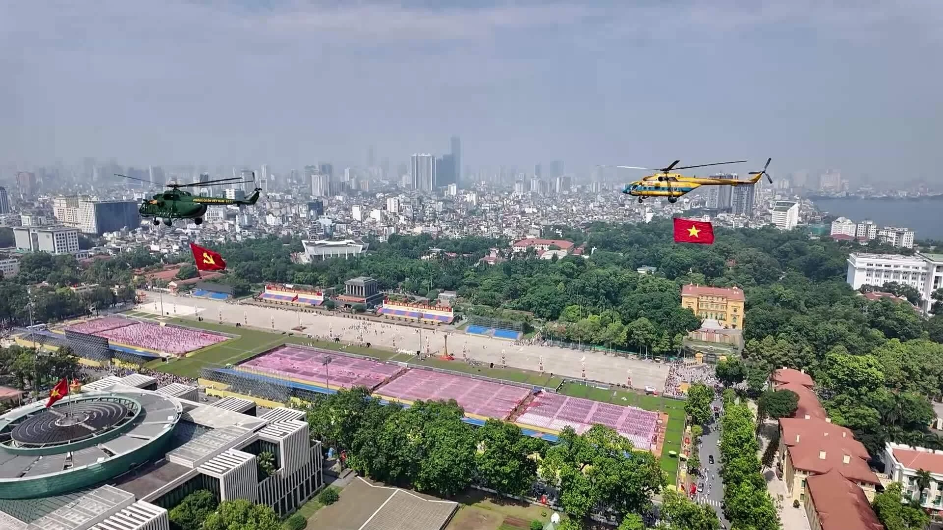 10 chiếc trực thăng mang theo cờ Đảng và cờ Tổ quốc bay trên quảng trường Ba Đình sau khi cất cánh lần 2 từ sân bay Hòa Lạc.