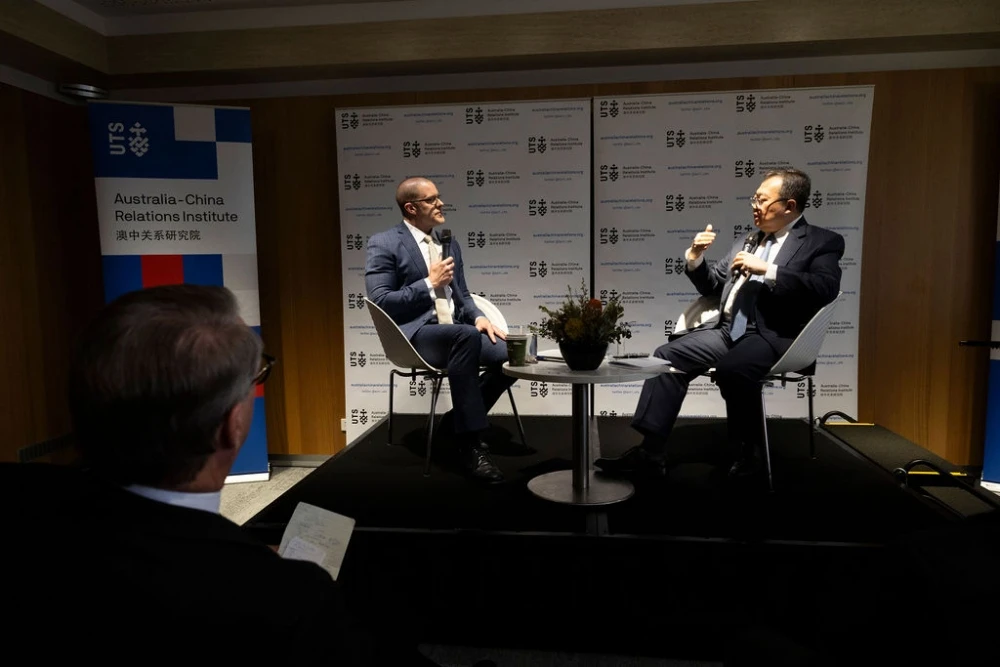 Ông Lưu Kiến Siêu (phải) phát biểu tại Viện nghiên cứu quan hệ Australia-Trung Quốc, Đại học UTS.