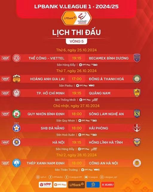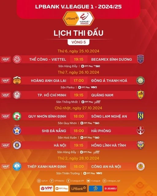 Vòng 5 Giải VĐQG LPBank 2024/2025 sẽ có 6 trận đấu được áp dụng VAR. Cặp đấu duy nhất không có sự xuất hiện của VAR là cuộc so tài giữa SHB Đà Nẵng và Hải Phòng bởi cùng thời điểm, Quy Nhơn Bình Định gặp Sông Lam Nghệ An trên sân Quy Nhơn.