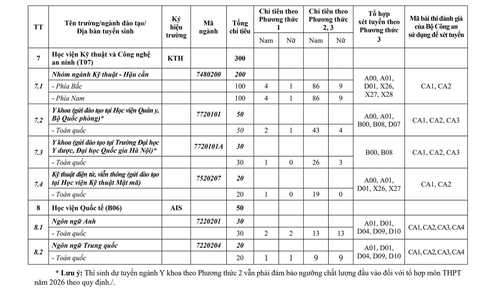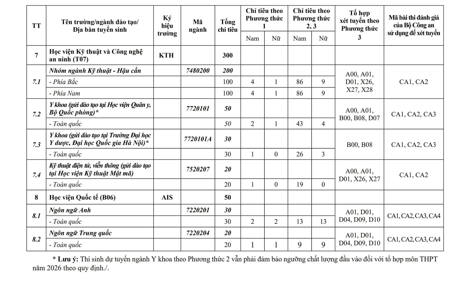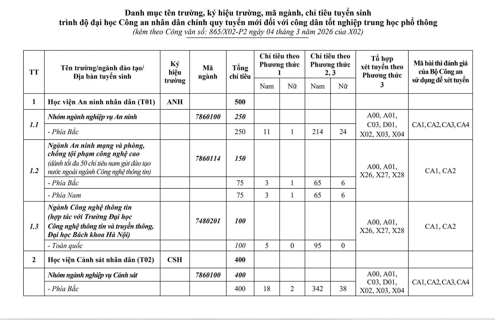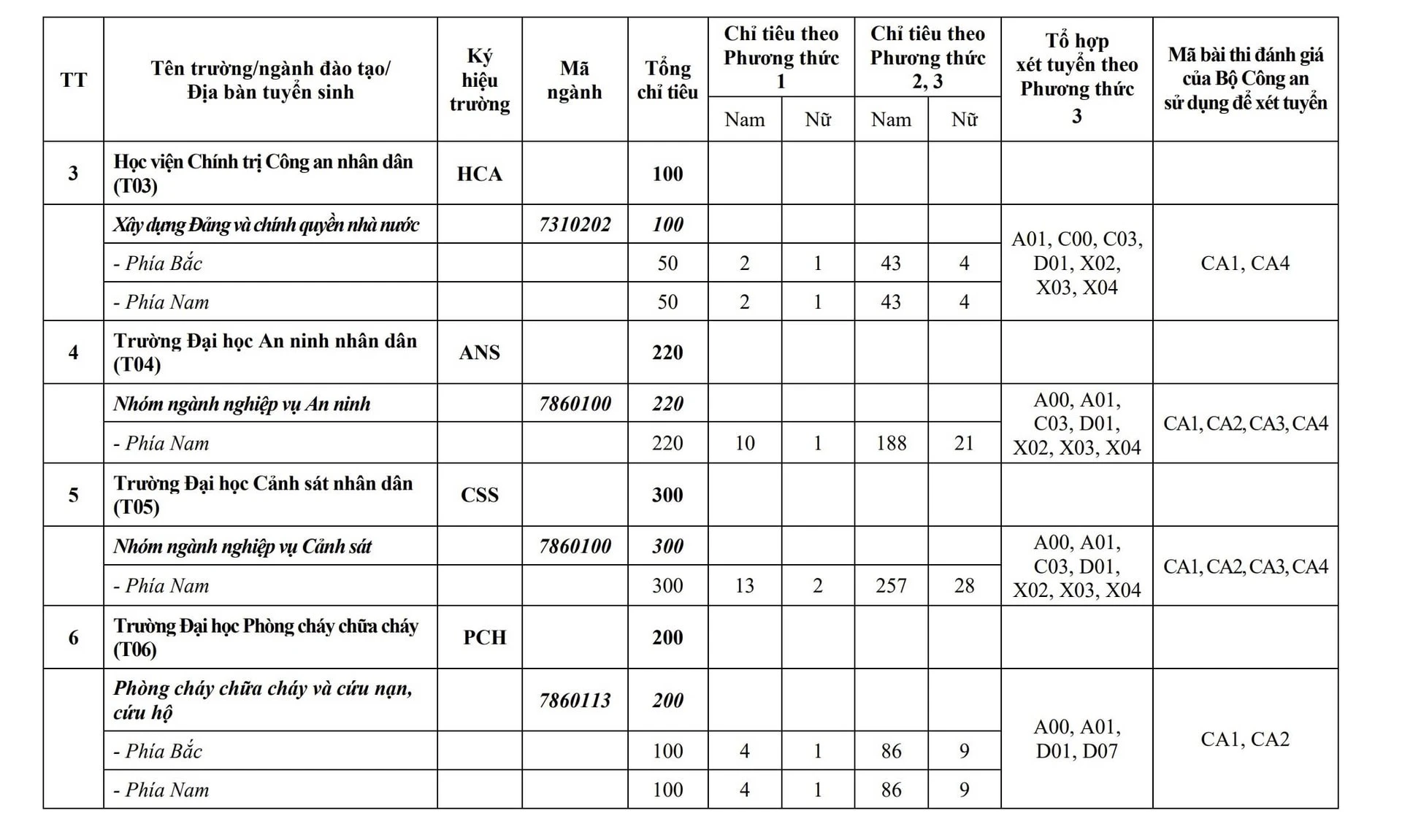 Với kết quả thi tốt nghiệp, Bộ Công an xét tuyển các tổ hợp: A00, A01, B00, B08, C00, C03, D01, D04, D07, D09, D10, X02, X03, X04, X26, X27, X28.