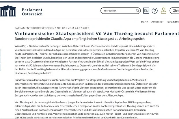 Trang thông tin của Quốc hội Áo đưa tin về chuyến thăm chính thức Áo của Chủ tịch nước Võ Văn Thưởng.