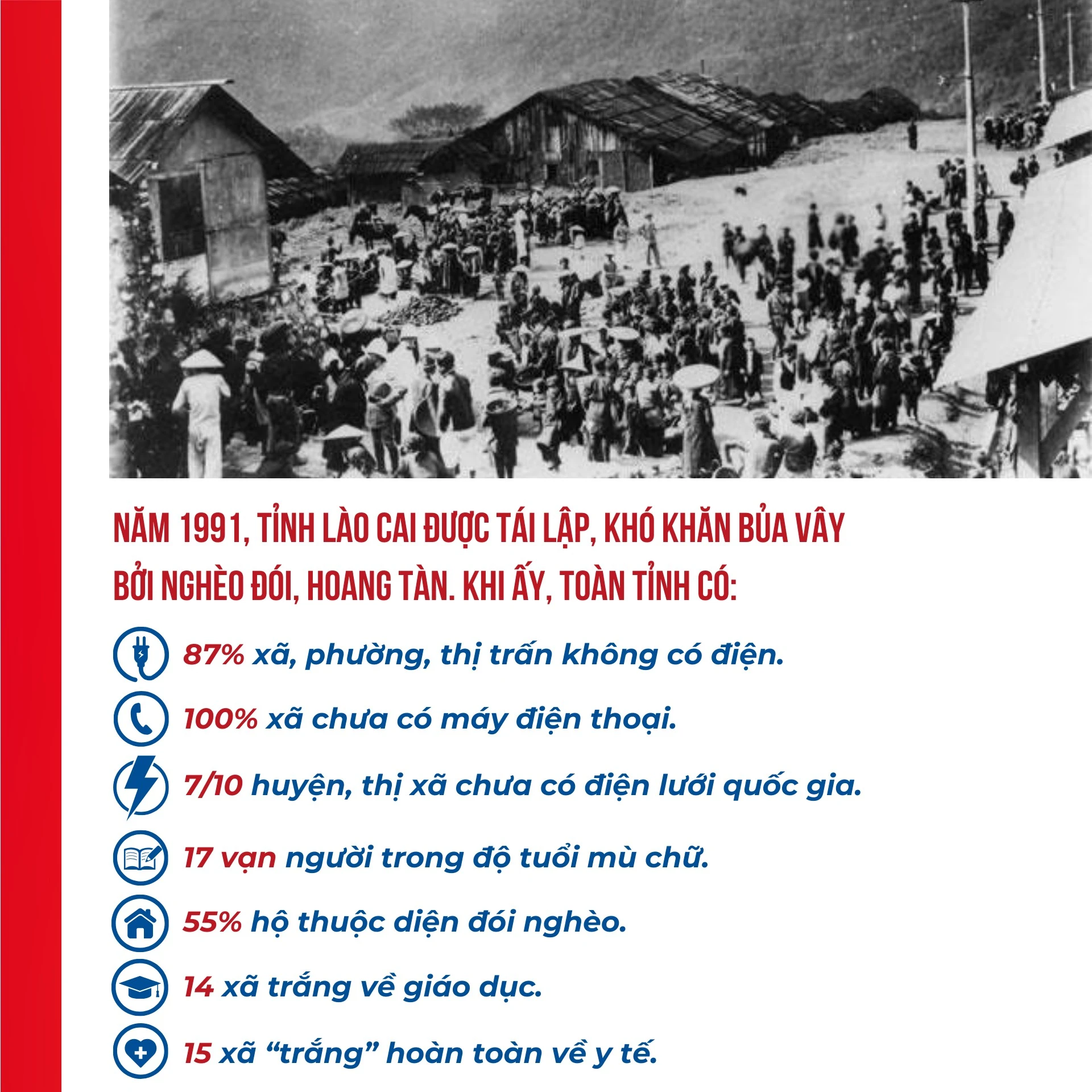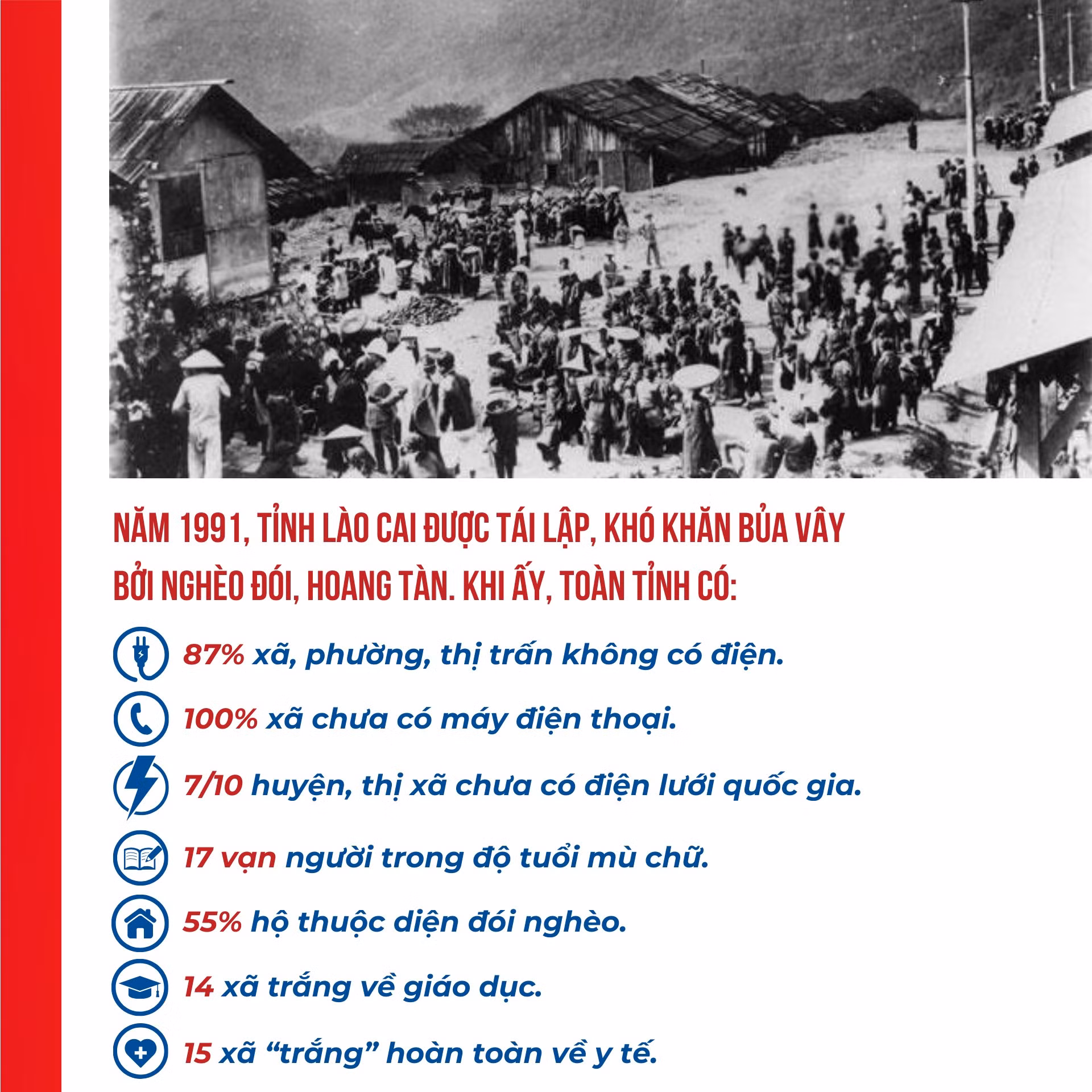 Buổi đầu tái lập, toàn tỉnh có 87% xã, phường, thị trấn không có điện; 100% xã chưa có máy điện thoại; 7/10 huyện, thị xã chưa có điện lưới quốc gia; 17 vạn người trong độ tuổi mù chữ, 60% trẻ trong độ tuổi không được đến trường; gần 55% hộ dân thuộc diện đói nghèo; 14 xã “trắng” về giáo dục, 15 xã “trắng” hoàn toàn về y tế… Những số liệu ấy là quá khứ không bao giờ quên về một mảnh đất hứng chịu bao đau thương, hoang tàn bởi chiến tranh. Từ quá khứ đến hiện tại, hôm nay một Lào Cai tươi sáng đang vững bước đi lên với sức bật phi thường mà toàn Đảng, toàn quân và Nhân dân các dân tộc Lào Cai cùng chung sức, đồng lòng kiến tạo.