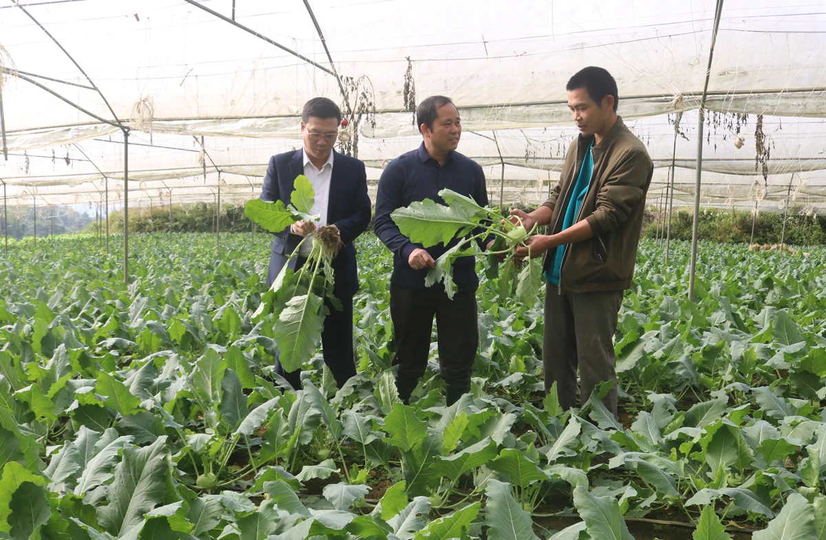 Đồng chí Đỗ Văn Duy, Giám đốc Sở Nông nghiệp và Phát triển nông thôn tỉnh (giữa ảnh) thăm mô hình trông rau an toàn ở Sa Pa.