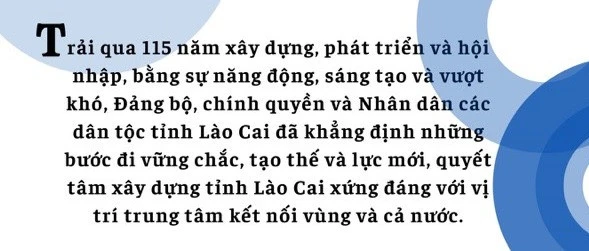 Nhìn lại những chặng đường phát triển đã qua, chúng ta tự hào về những thành tựu đã đạt được, bằng tất cả sức lực và trí tuệ, thậm chí cả sự hy sinh xương máu của lớp lớp thế hệ người Lào Cai. Tin tưởng rằng, với những thuận lợi, đặc trưng của Lào Cai, với ý chí, tinh thần đổi mới, sáng tạo và khát vọng vươn cao, vươn xa, cùng sự đồng thuận của Nhân dân, Đảng bộ, chính quyền, tỉnh Lào Cai sớm trở thành cực tăng trưởng, trung tâm kết nối, trung tâm phát triển của vùng Trung du, miền núi Bắc Bộ và của cả nước.