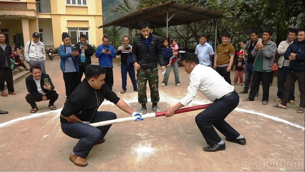 Sau phần lễ, phần hội diễn ra sôi nổi với các môn thể thao như kéo co, đẩy gậy, bóng chuyền hơi…, thu hút đông đảo Nhân dân tham gia, cổ vũ.