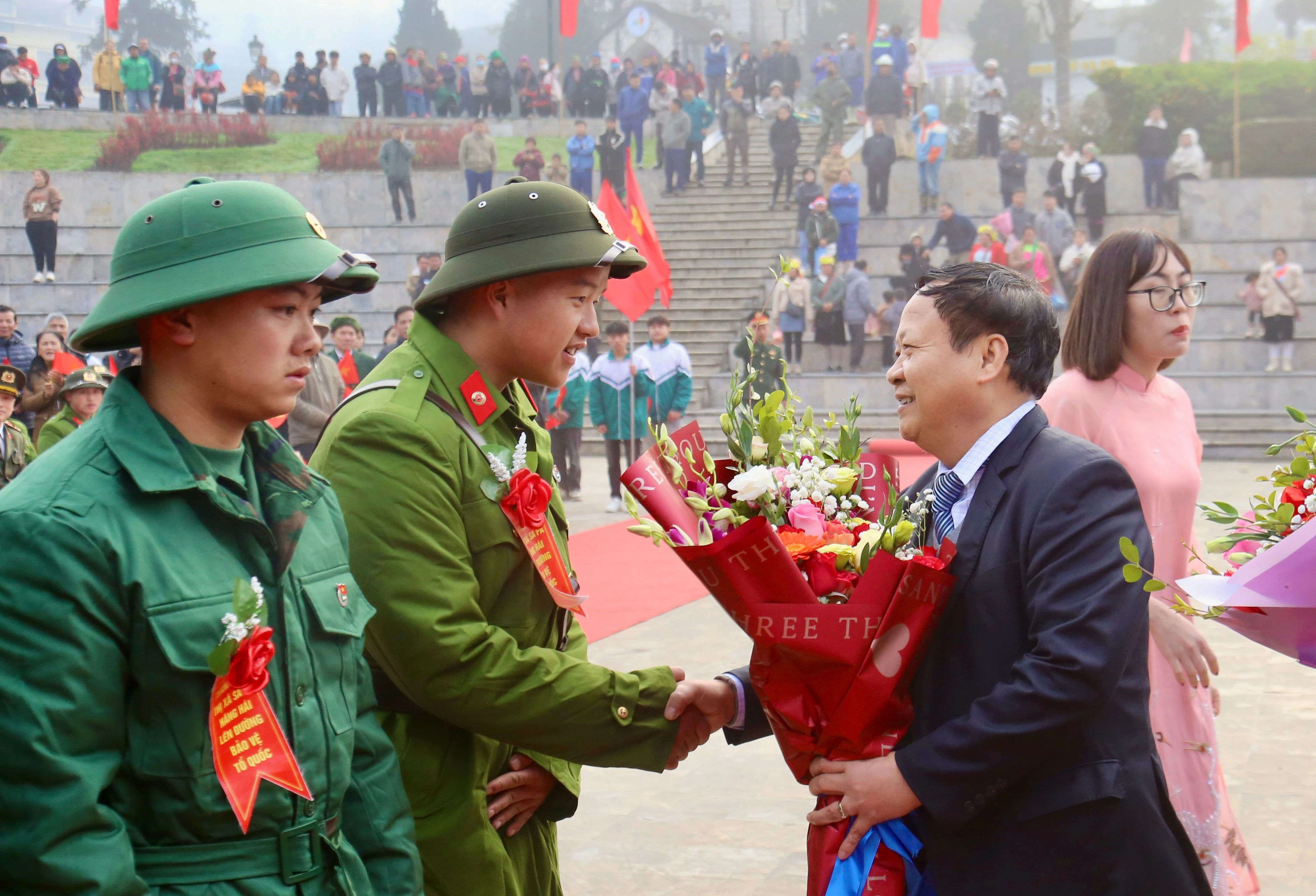 Sau nghi lễ thắp lửa truyền thống, thành viên Hội đồng nghĩa vụ quân sự tỉnh và lãnh đạo huyện Bảo Thắng đã tặng hoa chúc mừng, động viên tân binh lên đường nhập ngũ.