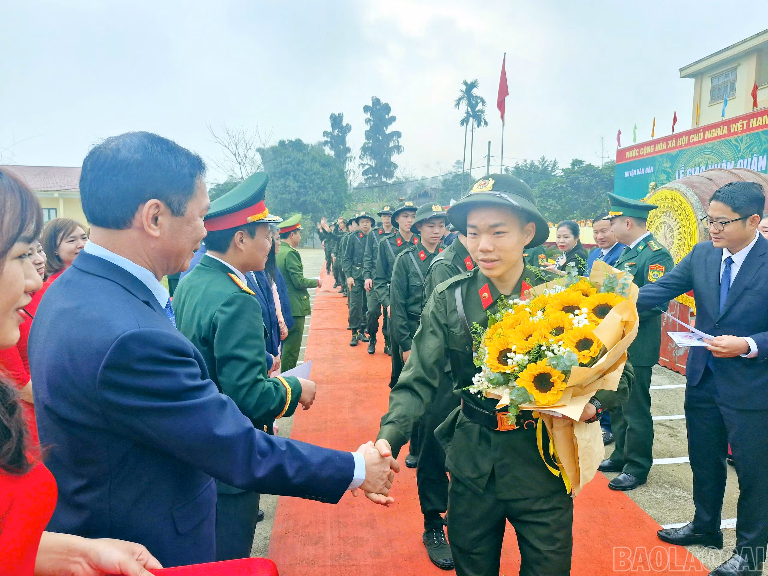 Lãnh đạo huyện tặng hoa, động viên tân binh.