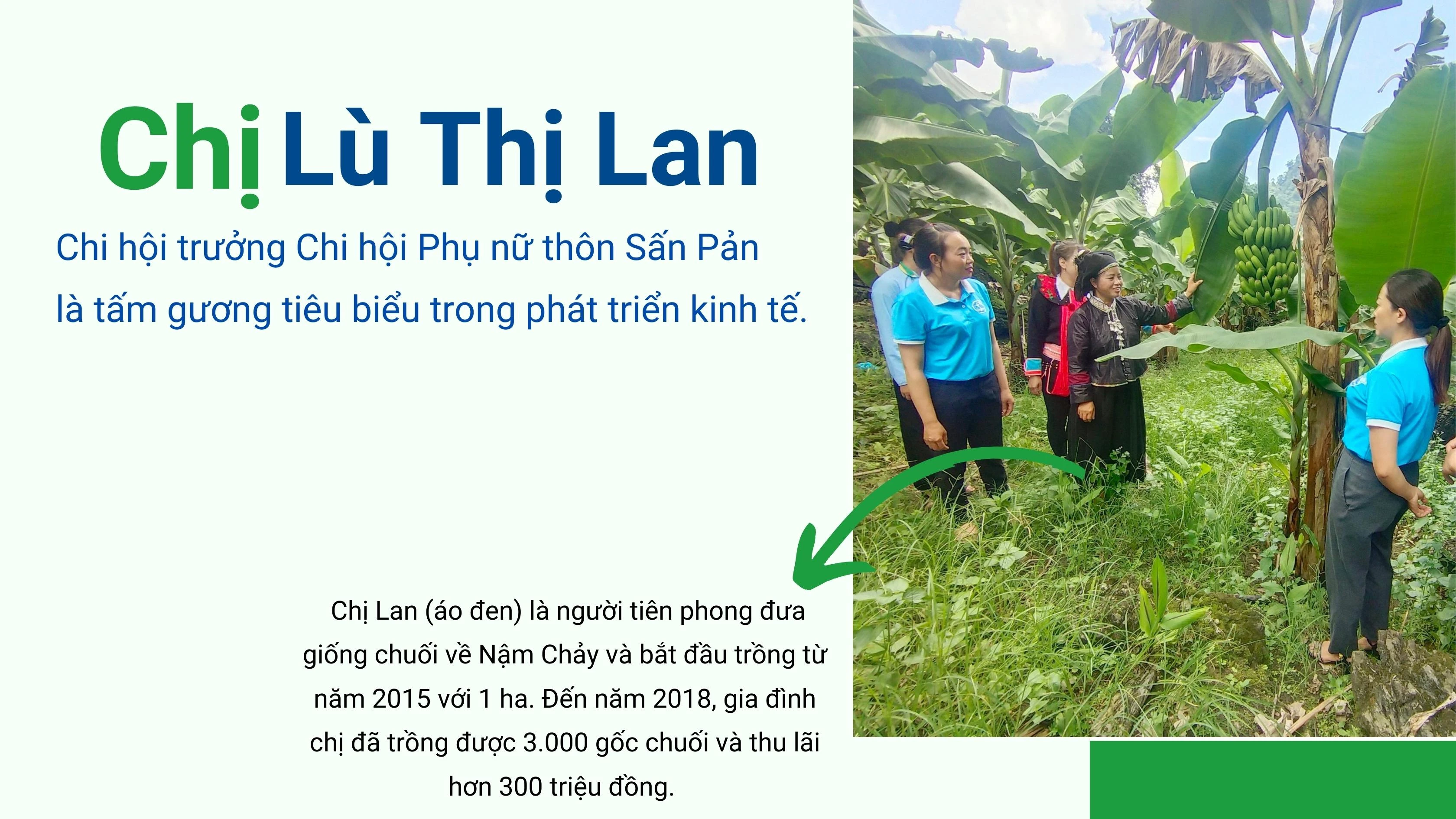 Chị Lan là người tiên phong đưa giống chuối về Nậm Chảy và bắt đầu trồng từ năm 2015 với 1 ha. Đến năm 2018, gia đình chị đã trồng được 3.000 gốc chuối và thu lãi hơn 300 triệu đồng. Chị Lan tích cực tuyên truyền, vận động người dân và có công lớn hình thành vùng trồng chuối hàng hóa quy mô 250 tại xã Nậm Chảy vào năm 2022.