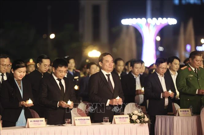 Phó Thủ tướng Chính phủ Trần Lưu Quang cùng các đại biểu thắp nến tưởng niệm các nạn nhân tử vong do tai nạn giao thông năm 2023 tại buổi lễ. Ảnh: Trọng Đạt/TTXVN