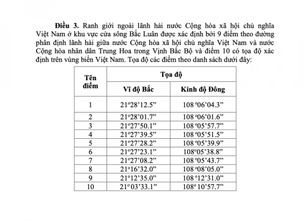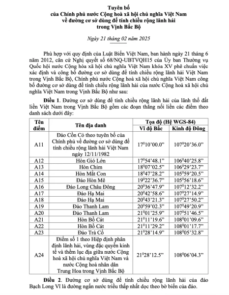 Đường cơ sở dùng để tính chiều rộng lãnh hải Việt Nam trong Vịnh Bắc Bộ được xác định trên cơ sở các quy định của UNCLOS, phù hợp với đặc điểm địa lý và tự nhiên của Vịnh Bắc Bộ và không ảnh hưởng đến các điều ước quốc tế mà Việt Nam tham gia hoặc là thành viên.
