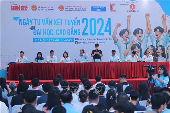 Các chuyên gia giải đáp những thắc mắc của thí sinh và phụ huynh tại "Ngày xét tuyển đại học, cao đẳng năm 2024". Ảnh: Hoàng Hiếu/TTXVN