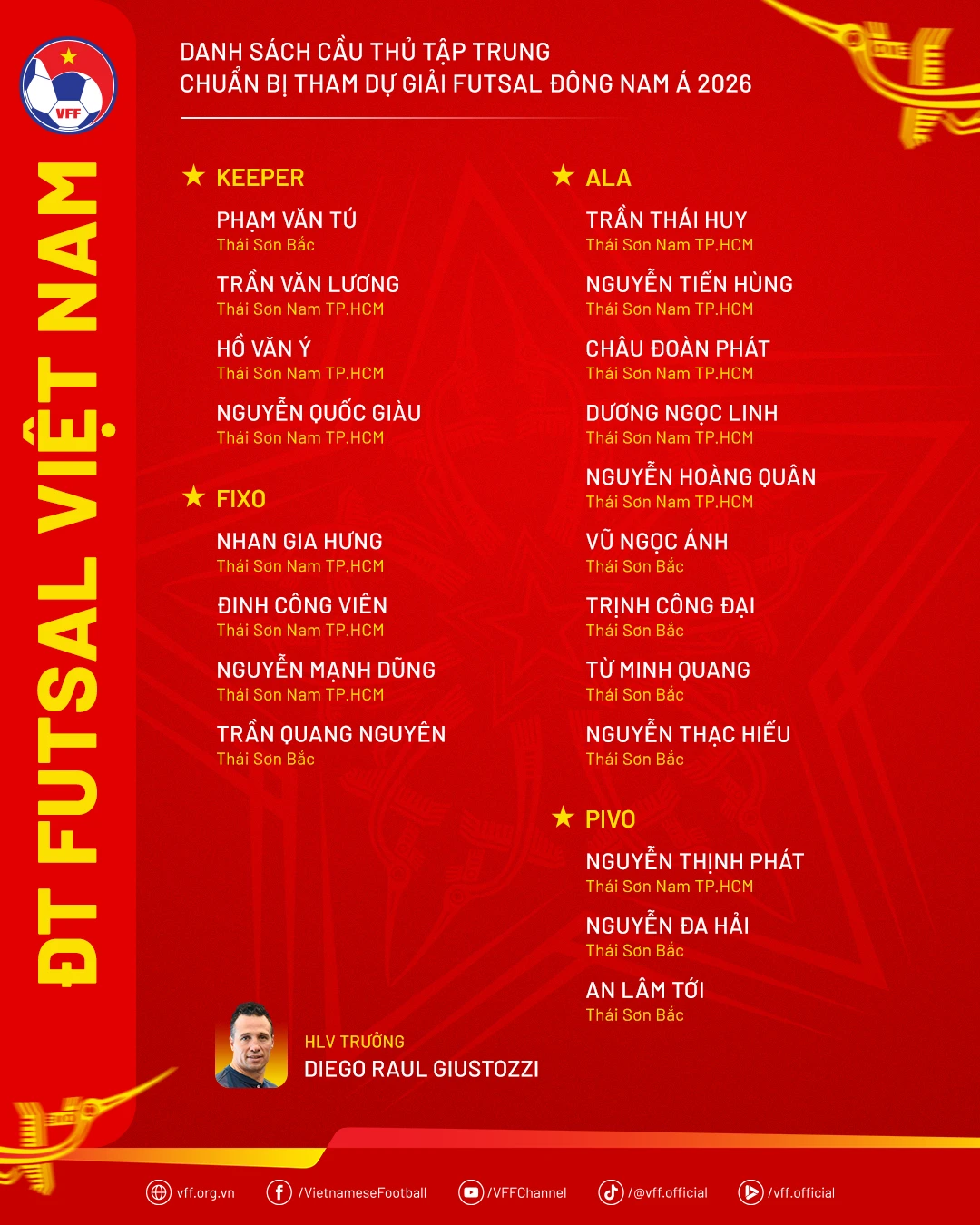 Về cơ bản, lực lượng từng tham dự VCK futsal châu Á 2026 tiếp tục được HLV Diego Giustozzi tin tưởng sử dụng trong đợt tập trung lần này. Những cái tên như Gia Hưng, Công Viên, Mạnh Dũng, Đa Hải hay Ngọc Ánh đều là các cầu thủ có chuyên môn tốt, từng nhiều lần thi đấu quốc tế và thể hiện bản lĩnh trận mạc. Bên cạnh đó, ban huấn luyện cũng trao cơ hội cho một số gương mặt mới như Nguyên Thạc Hiếu hay An Lâm Tới nhằm tạo thêm sự cạnh tranh và thử nghiệm nhân sự trong quá trình chuẩn bị.